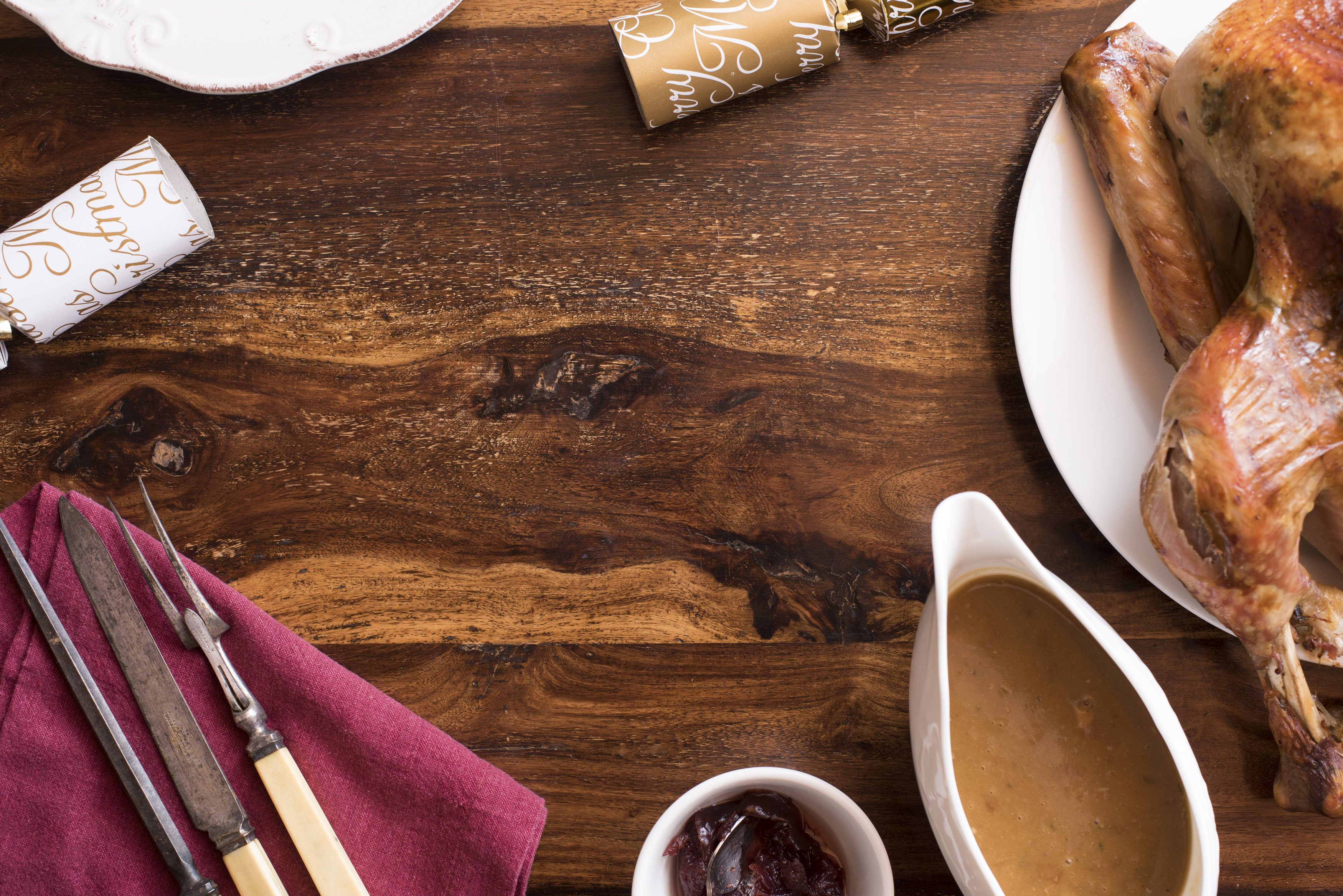 Keywords: christmas, dinner, food, meat, roast, turkey, crackers, frame, gravy, cranberry sauce, overhead, table, copy space, carving utensils, holiday
