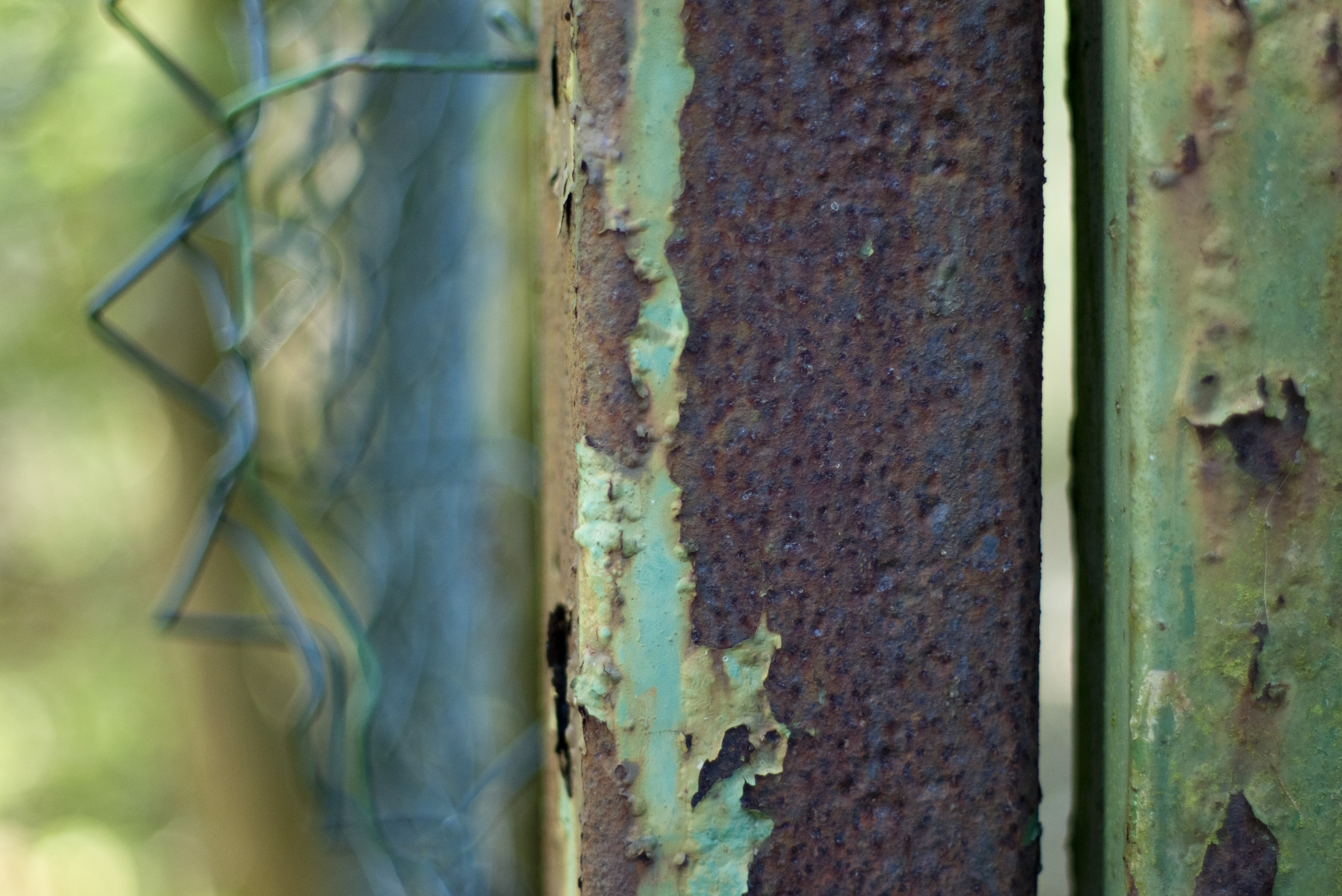 Keywords: chainlink, wire, rusted, rusty, pitted, pits, flake, flaky, flakey green, locked abstract