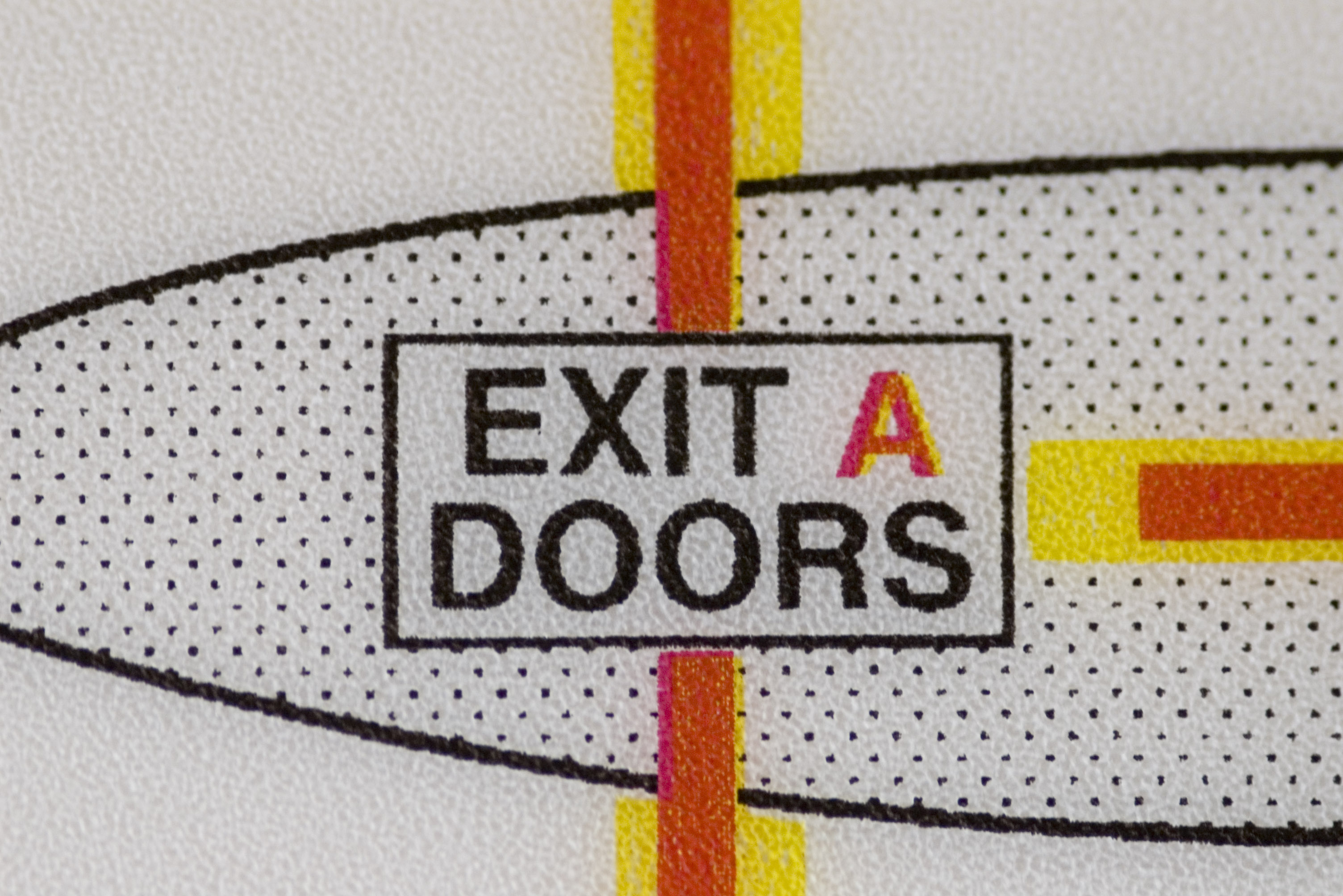 Keywords: exit a, plane, safety car, instruction, halftone, dots, doors, aircraft