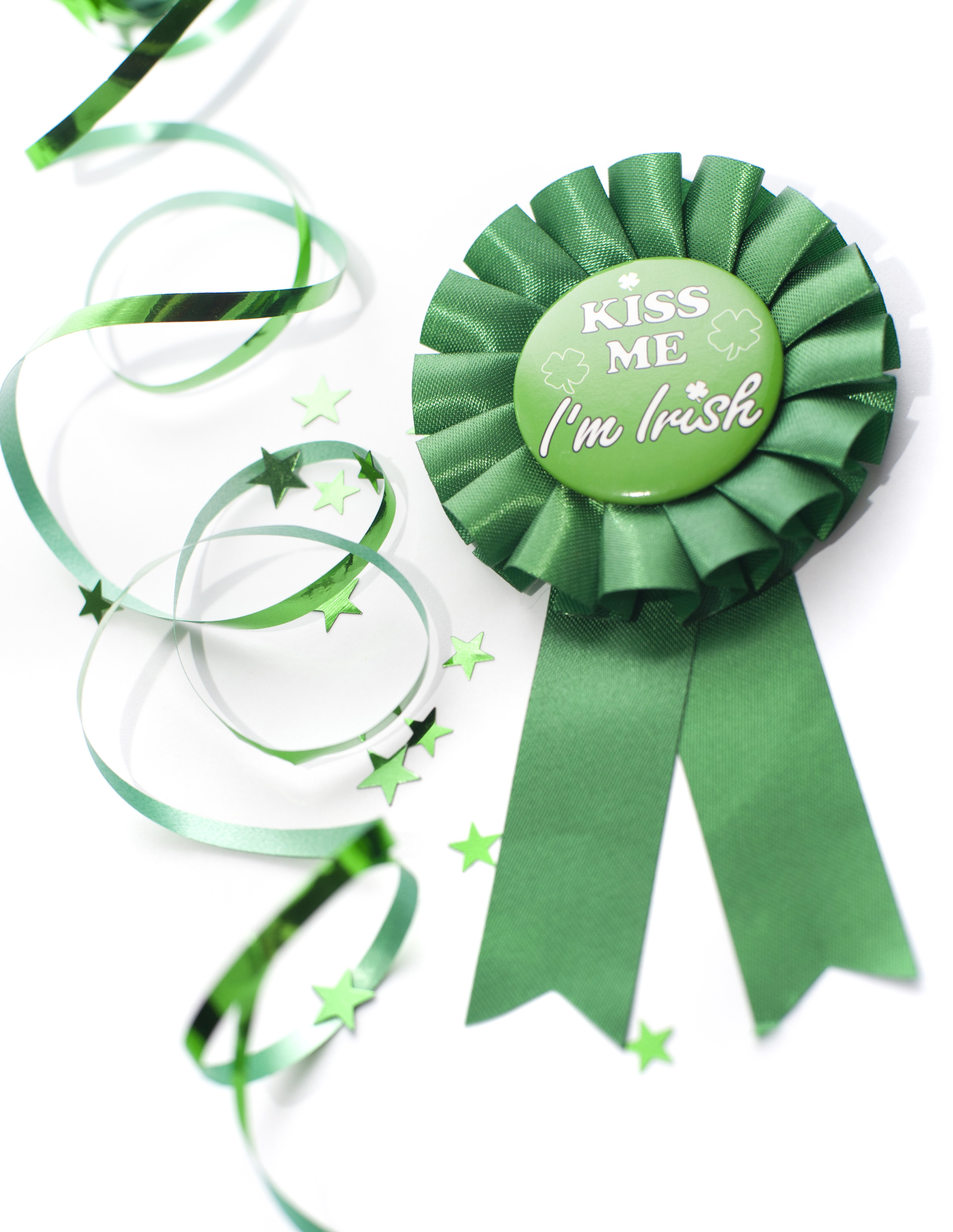Keywords: irish, green, rosette, ribbon, button, badge, celebration, patricks day, paddy, paddys day, ireland, kiss me, stars, bow, glitter sparkle, emerald