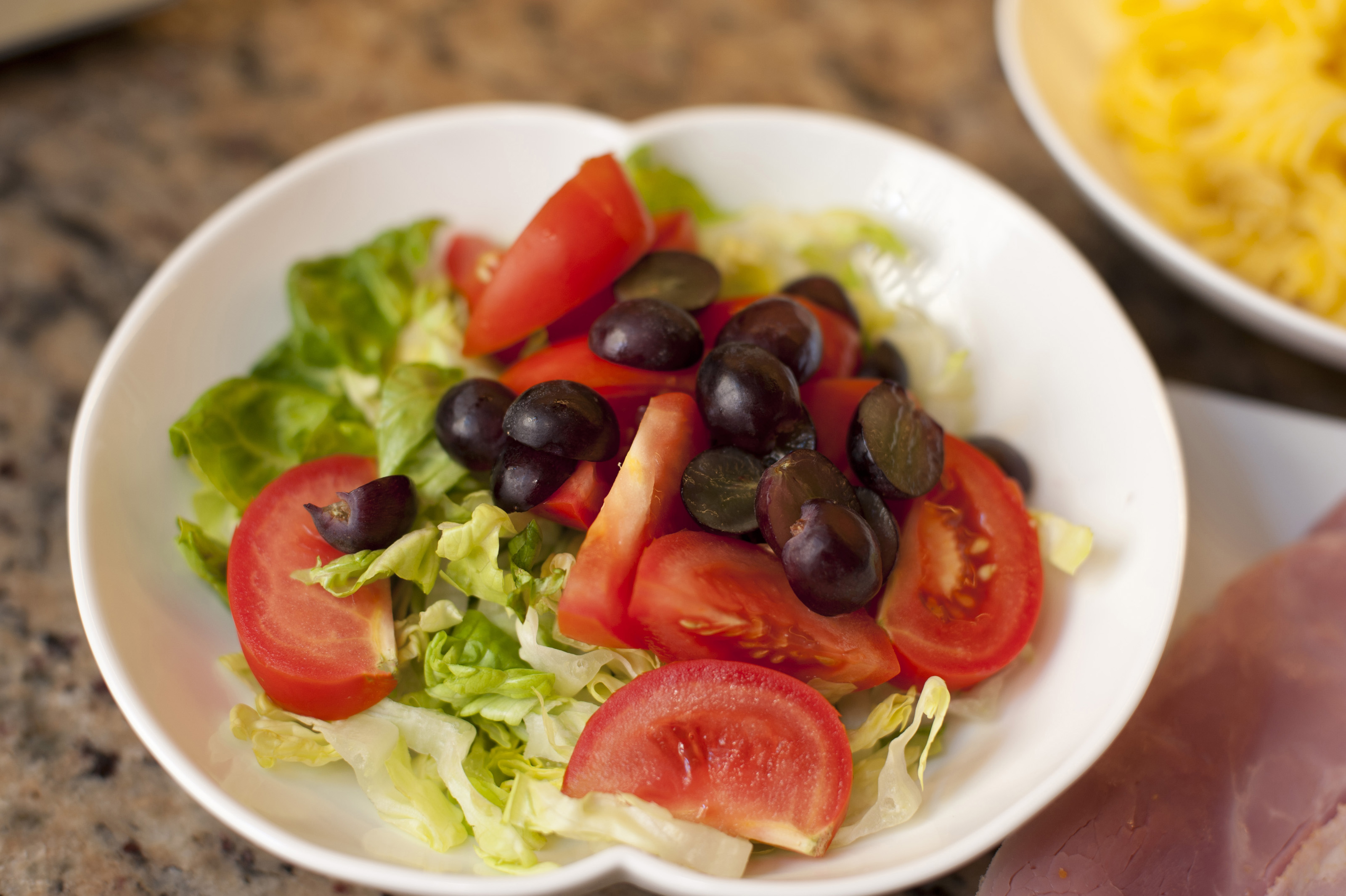 Keywords: accompaniment, appetizer, bowl, food, fruit, grapes, lettuce, salad, tomato, vegetables, fresh, vegetarian, healthy, nutrition, vegan