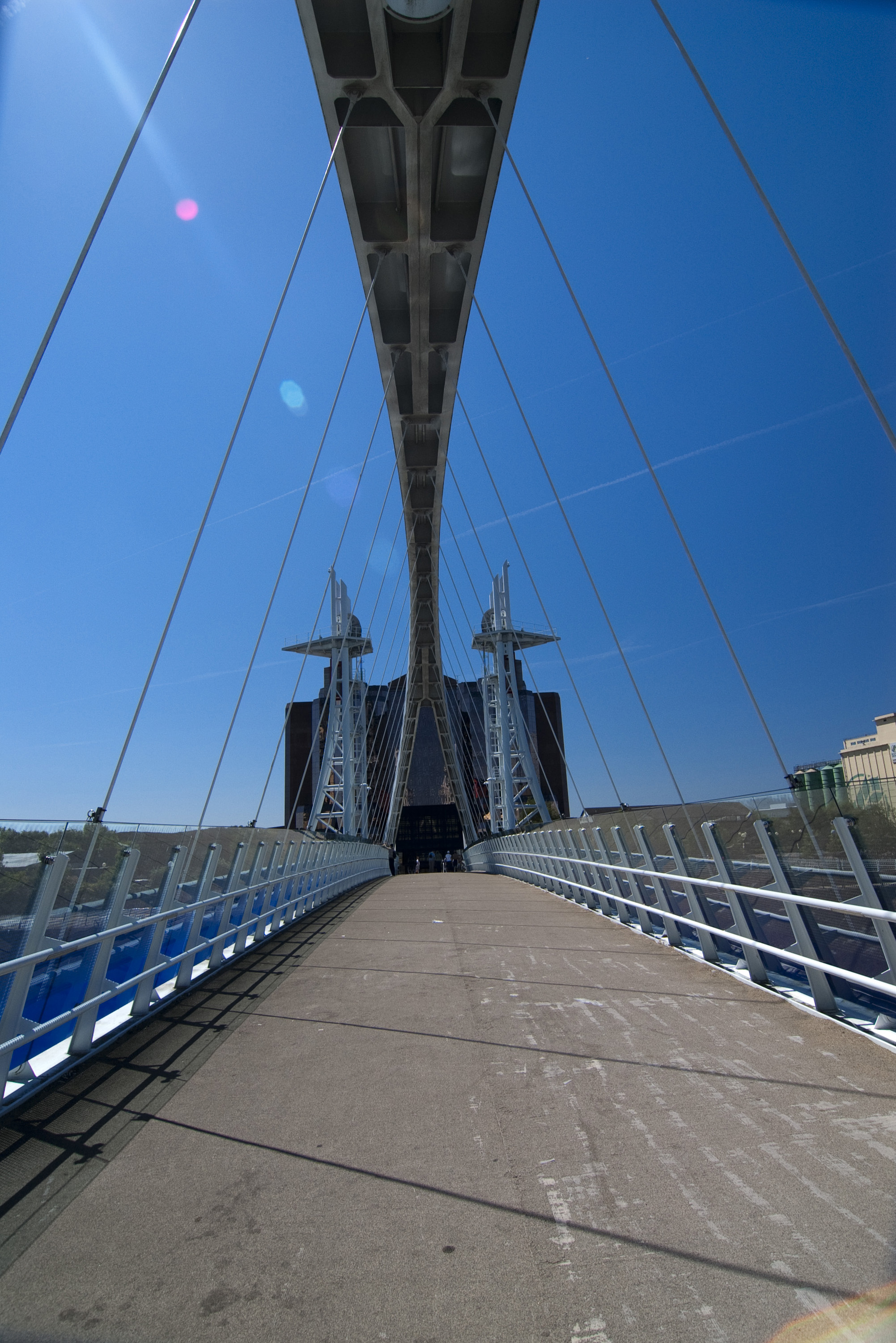 Keywords: view, walk, sun, pedestrian, walkway, lifting, manchester ship canal, blue, lens flare