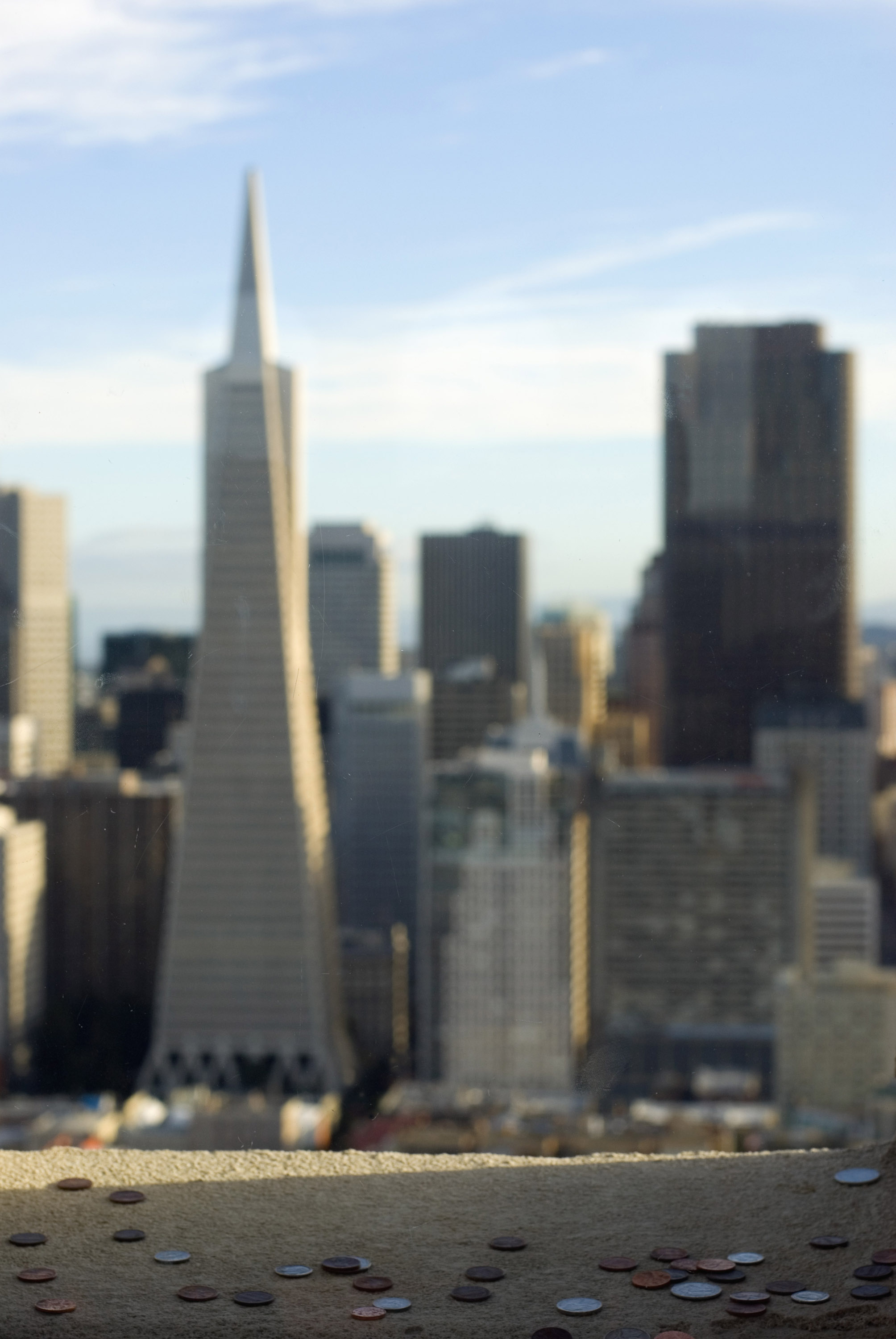 coins dropped from the coit tower to make a good luck wish with the city skyline out of focus in the distance