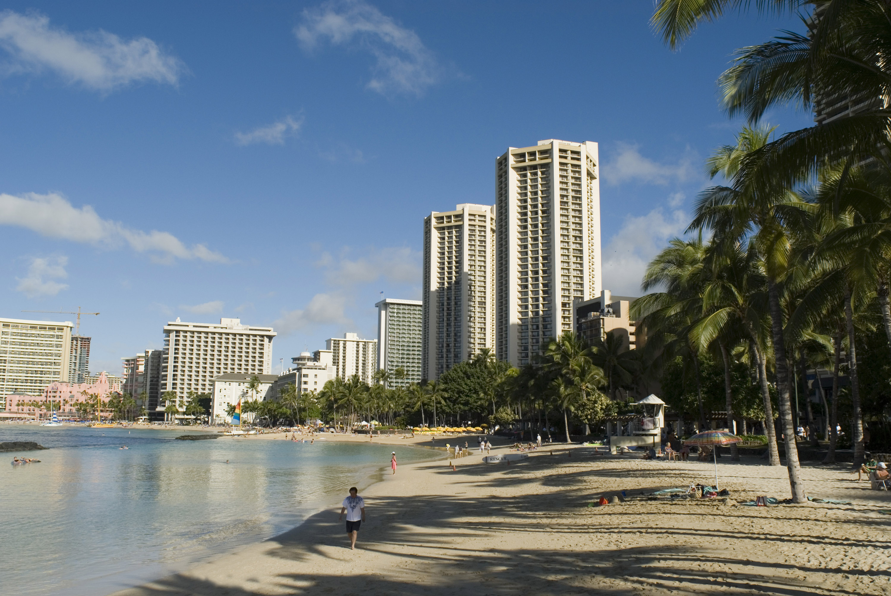 swimming lagoon and beach front lined with hotel towers, waikiki beach honolulu, hawaii