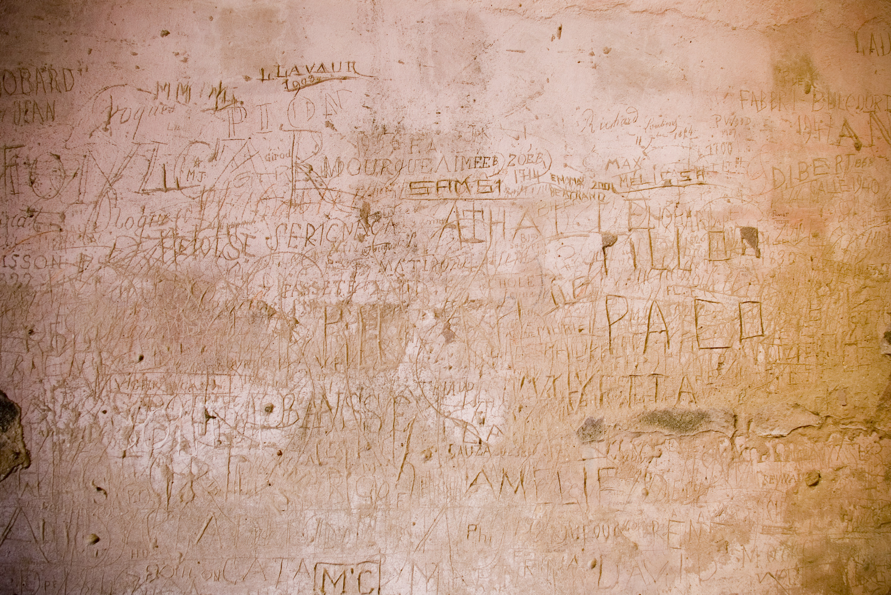 Keywords: scratch, scratched, scrawl, scralled, plaster, names, letters, charachters, hand written
