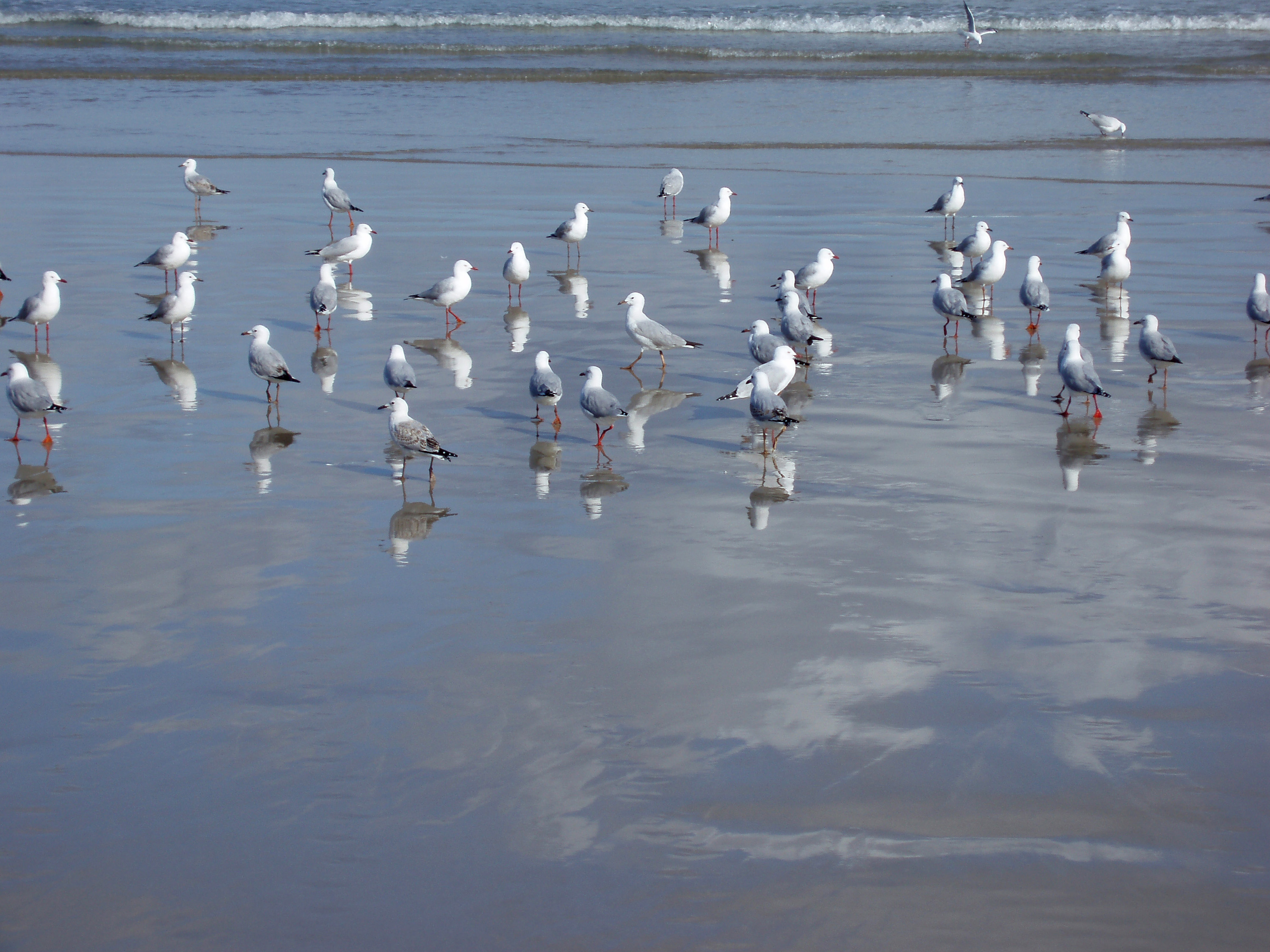 Keywords: birds, feeding, hunting, flock, back, multiple, many, animals, bird, feathers, gull, gulls, sand, beach, surf, waves, water, reflection, mirror, wet