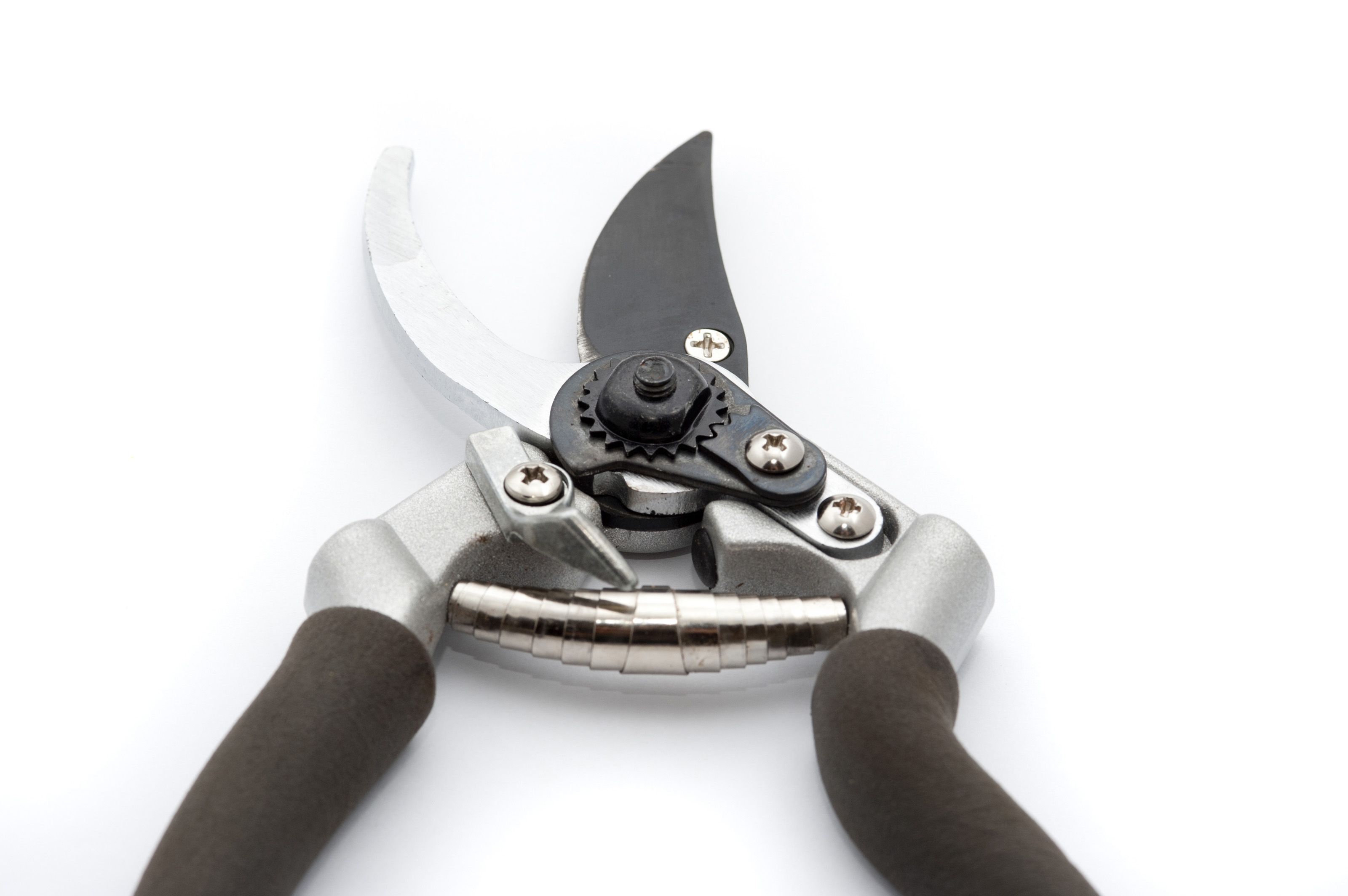 Pair of sharp metal garden secateurs or pruning shears for cutting back plants in spring on a white background with the blades facing away