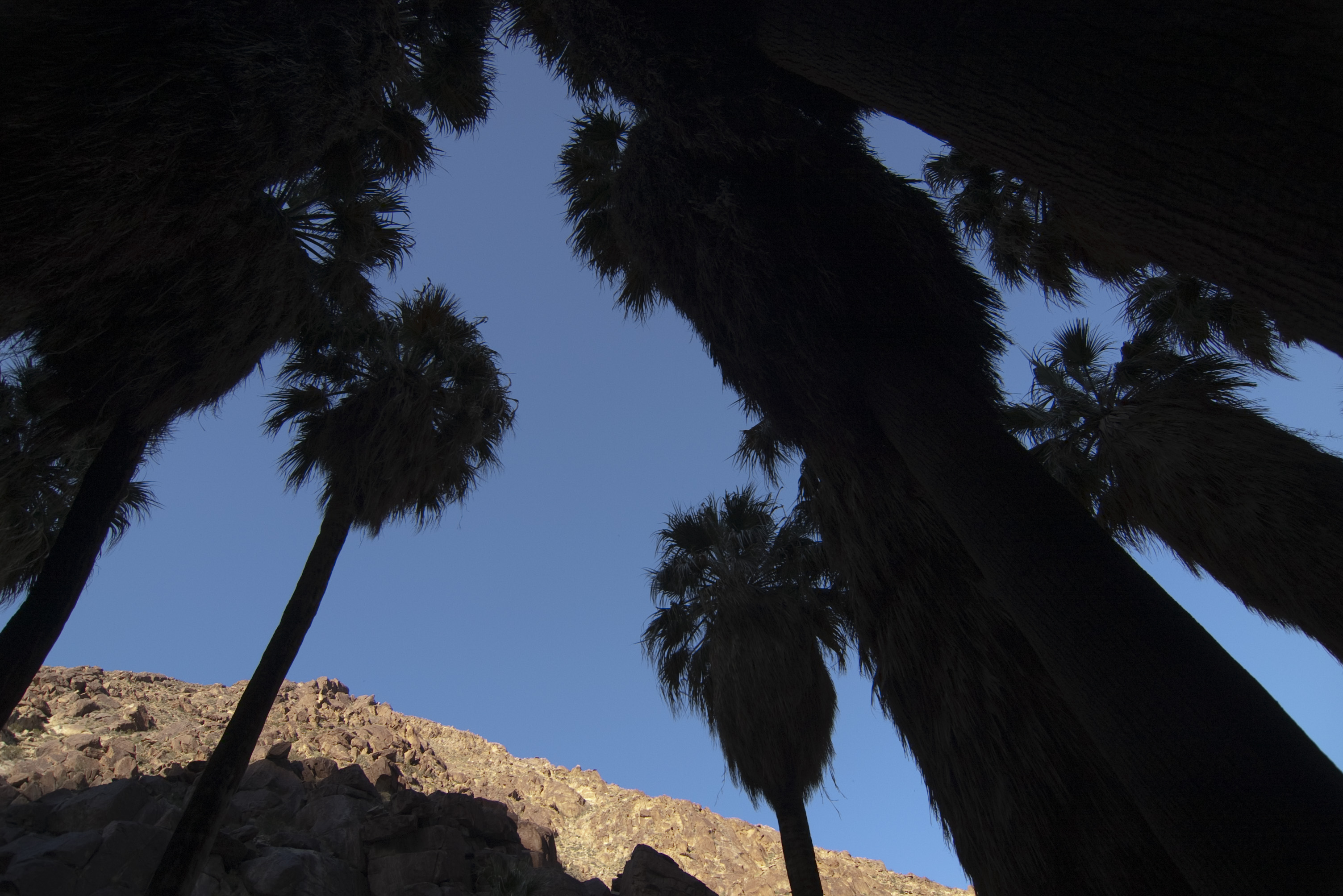 Keywords: black, low key, desert, sky, shady, palm, tree, blue, clear, cool