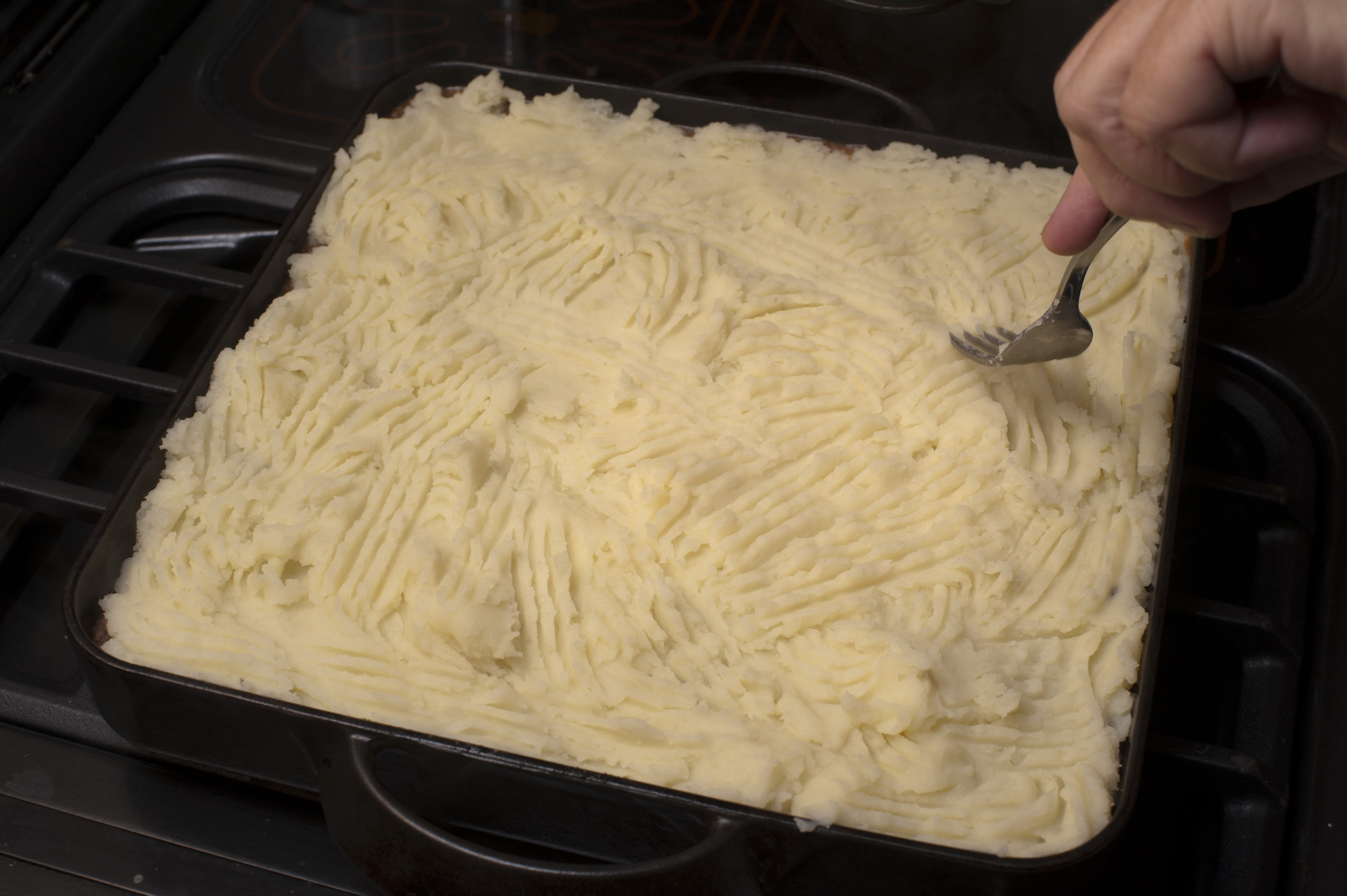 Keywords: baking, cooking, cottage pie, crust, fork, mashed, meat, pattern, potato, preparation, savory, scoring, topping, food, shepherds pie