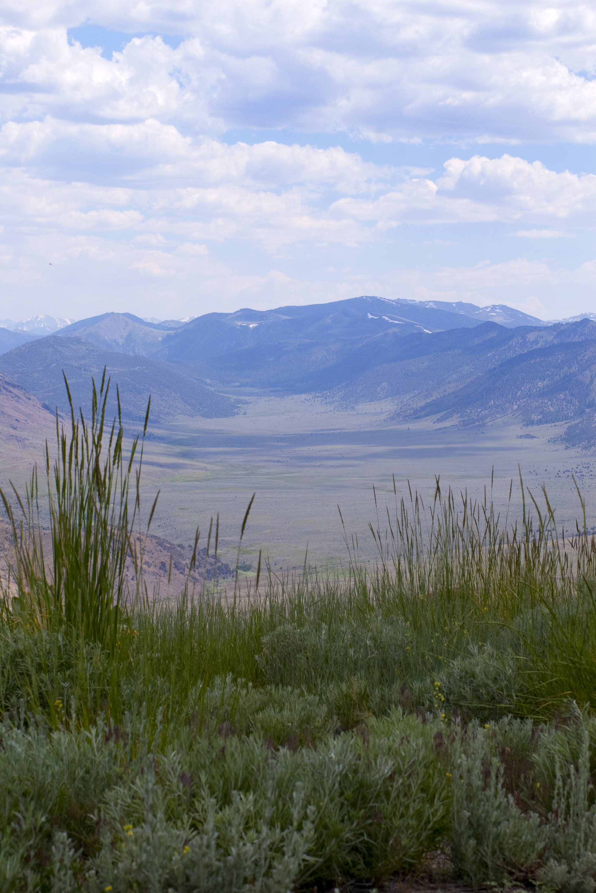 Keywords: landscape, view, vista, scenic, mountains, sierra navada, california, valley, green, flat, high country, alpine, grass, pants, vegetation, clouds, sky, cloudy, haze, pasture