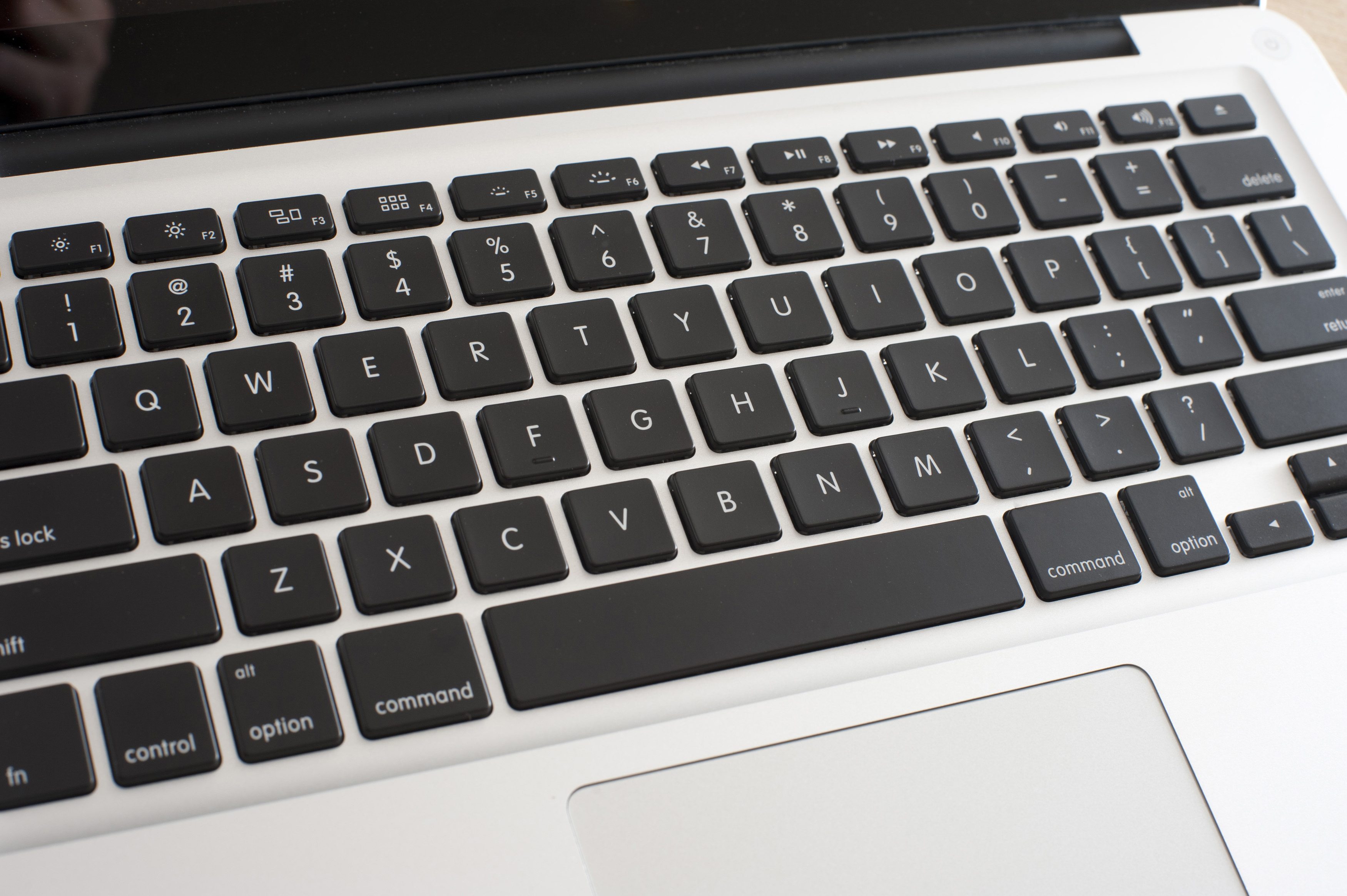 High angle close up view of an open silver laptop showing the touch pad and keyboard with black keys