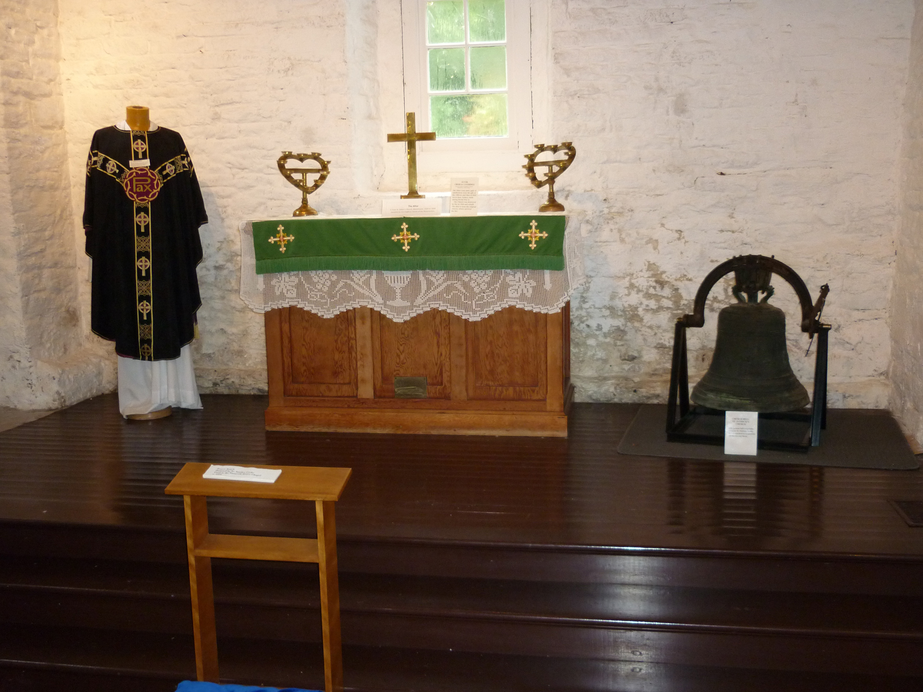 Small simple altar in a rustic church or chapel with a priests robes and bronze bell on display flanking the altar