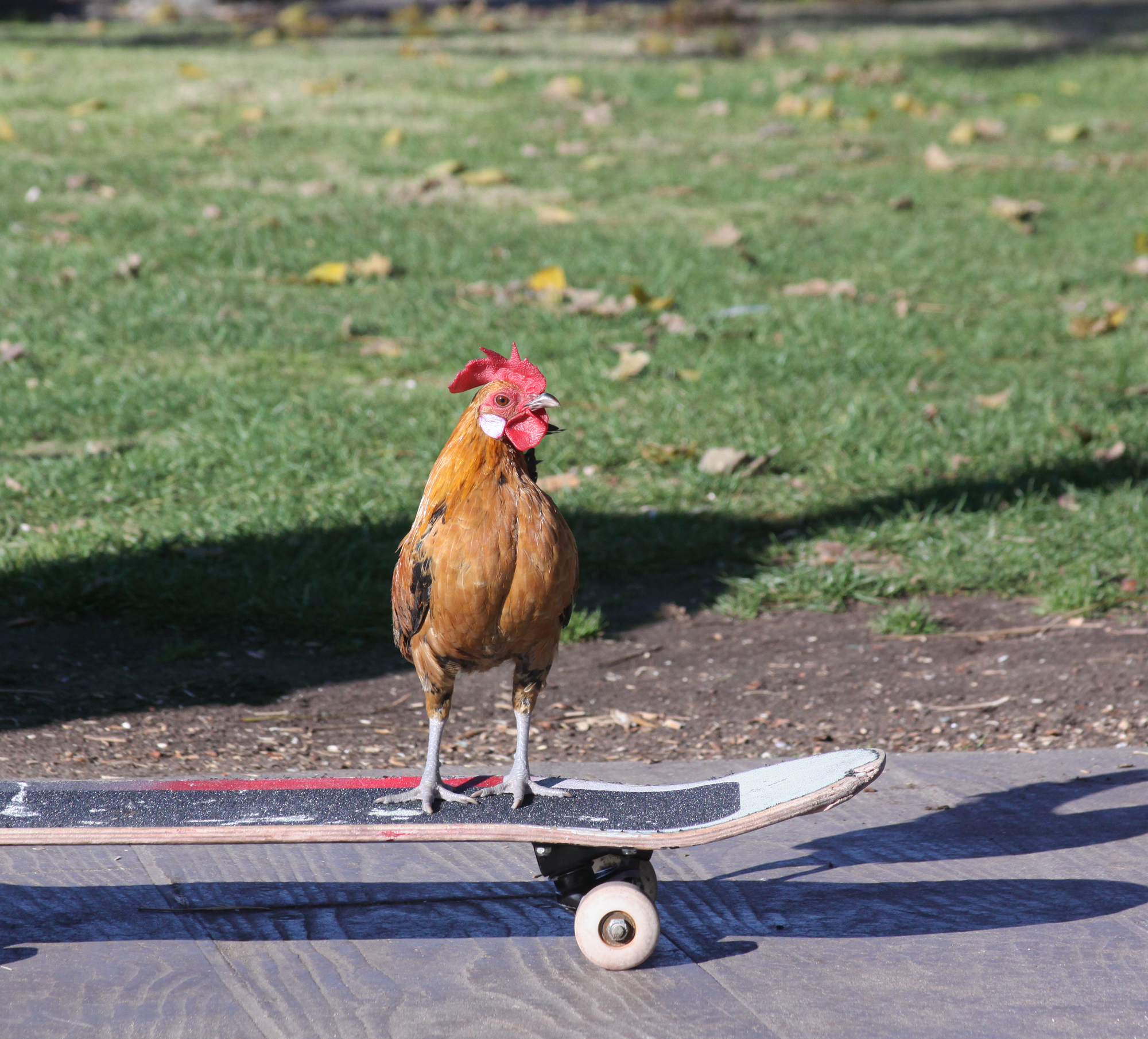 Skateboarding chicken. A chicken that loves to skateboard.