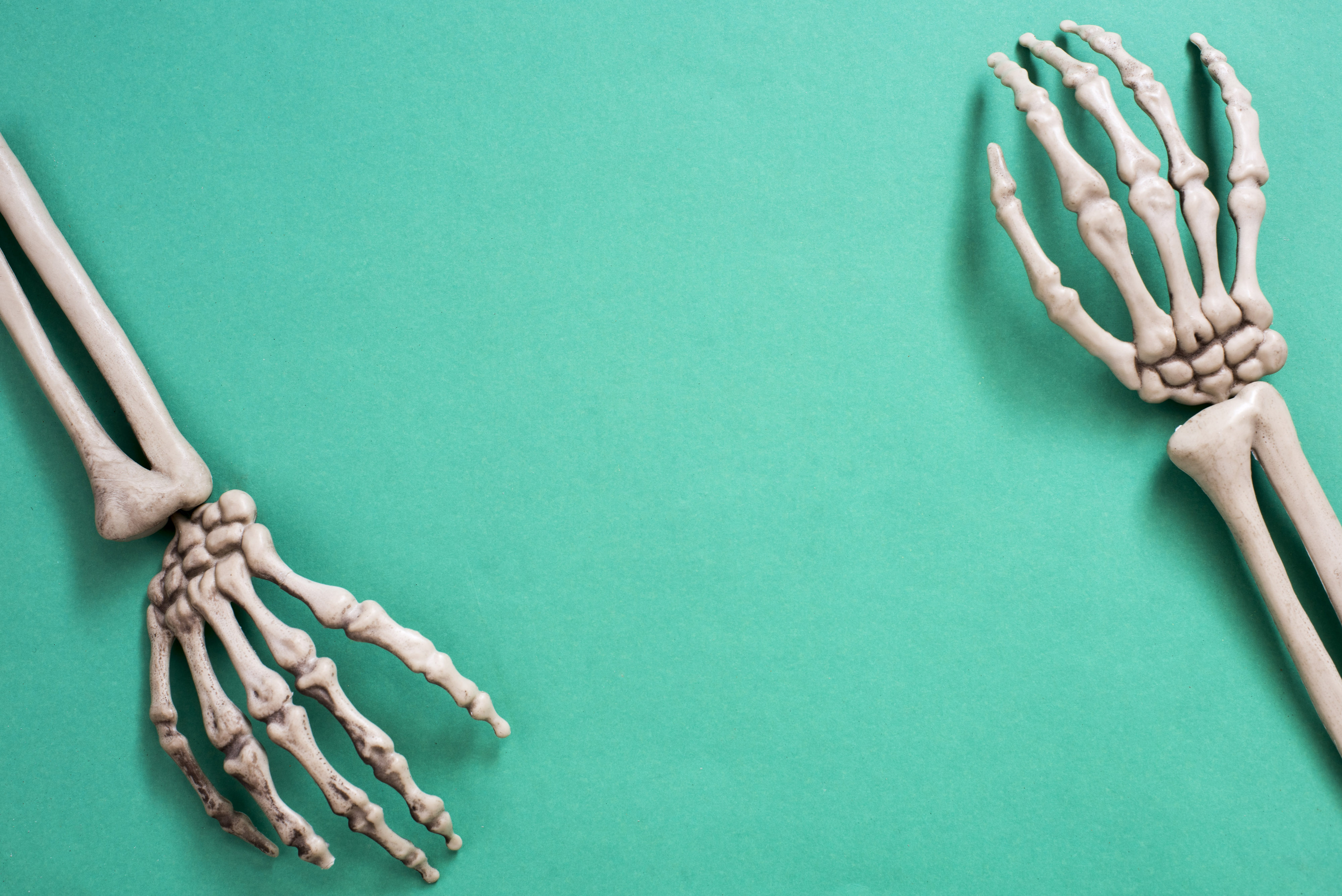 Keywords: skeleton, bones, halloween, decoration, flat lay, scary, scare, bones, boney, creepy, green, digits, finger, copyspace