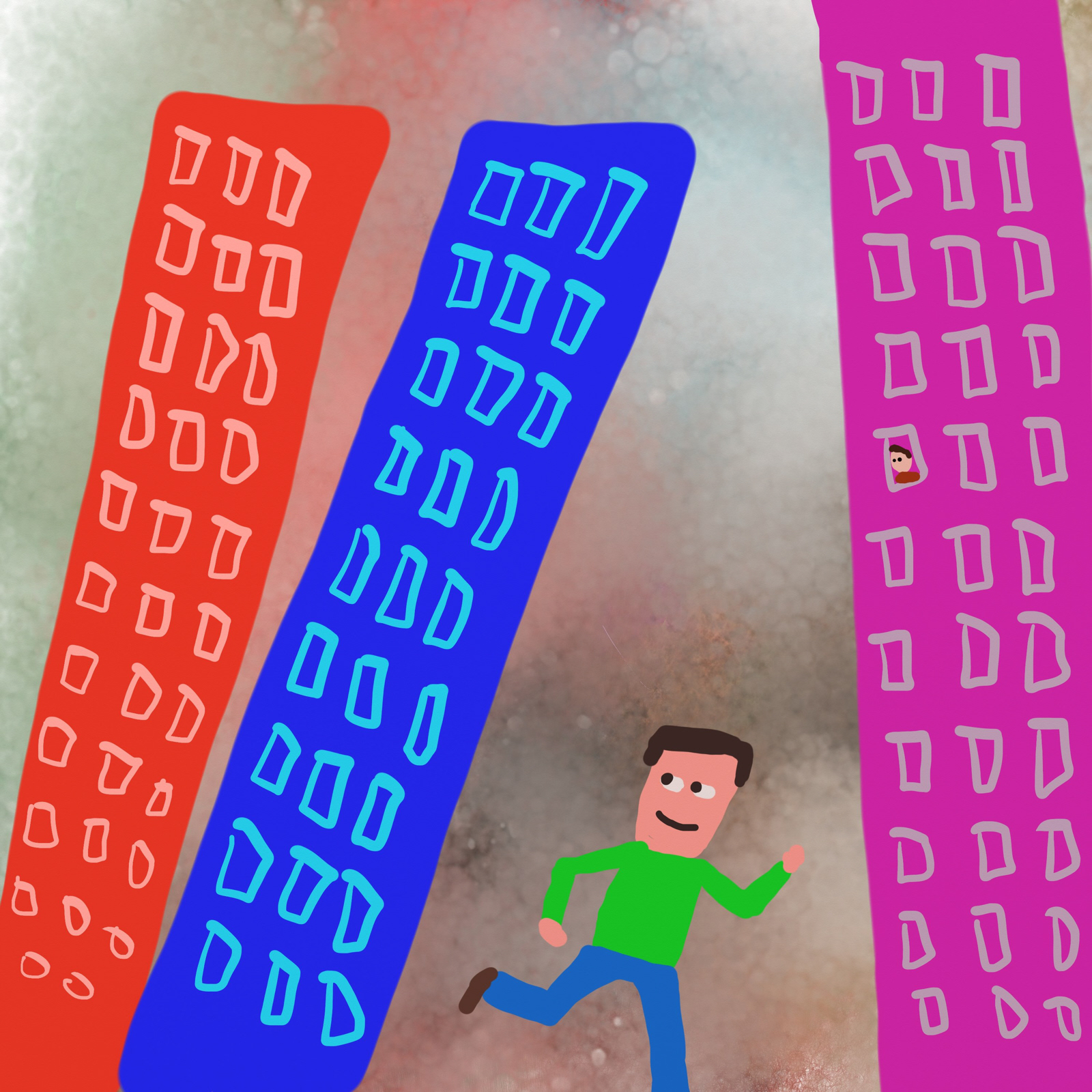 A man running in the city amongst tall skyscraper buildings.