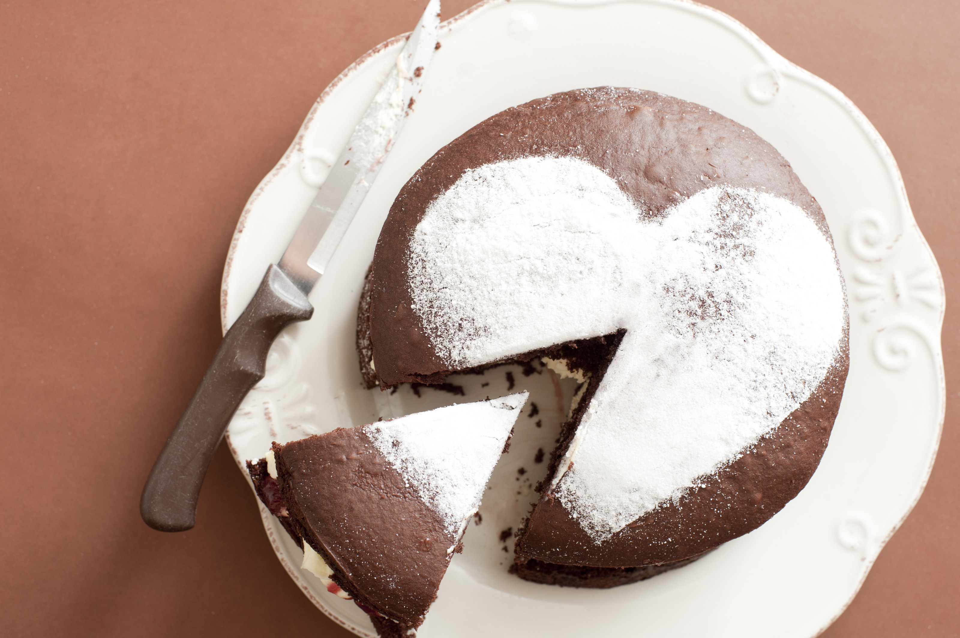 Aerial Shot of Sliced Chocolate Cake with Heart Shape Sugar on Top, Served on White Plate with Knife on Side. Placed on brown Table.