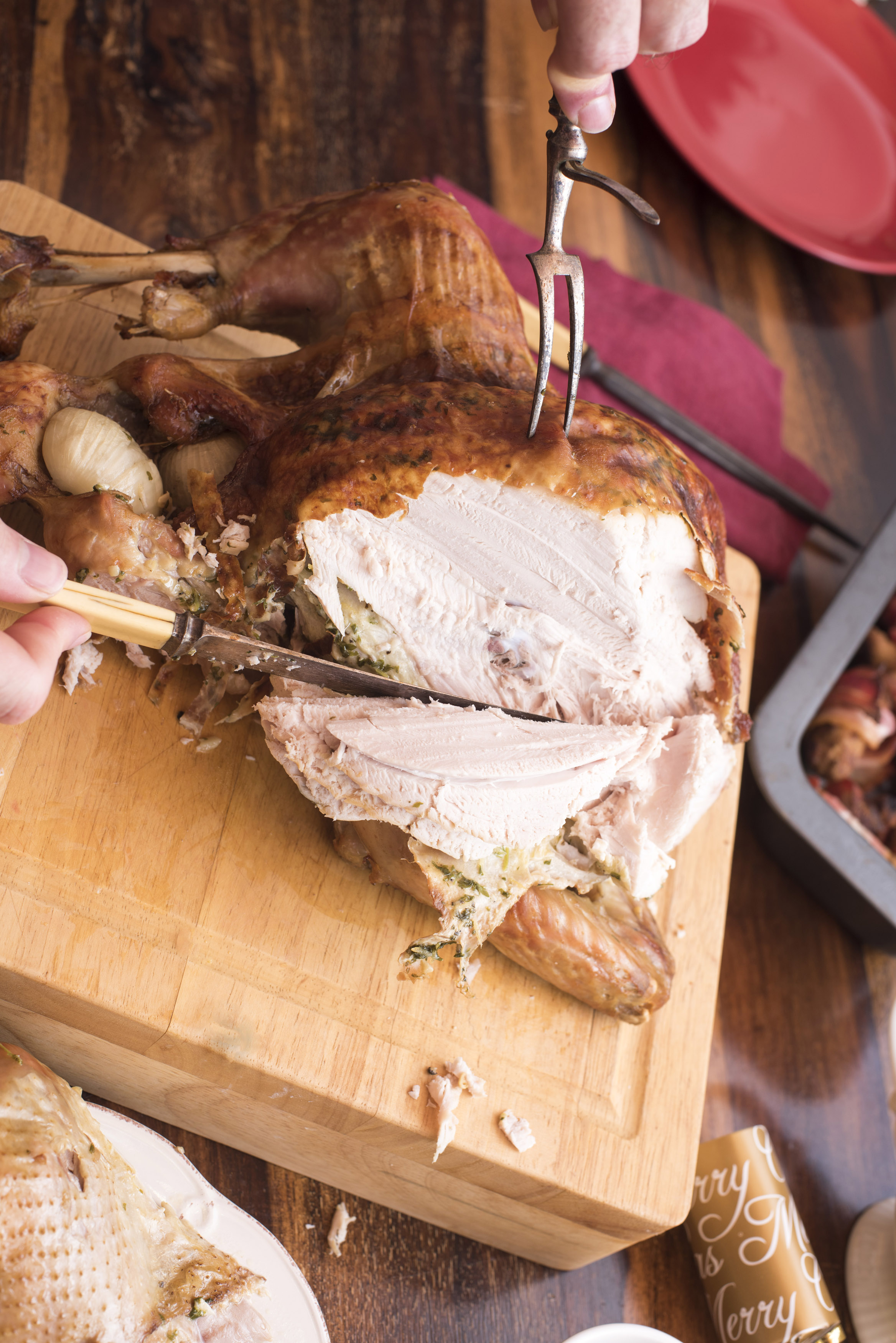 Keywords: bird, christmas, food, poultry, roast, turkey, carving, slicing, breast, cutting board, serving, table, dinner, season, holiday