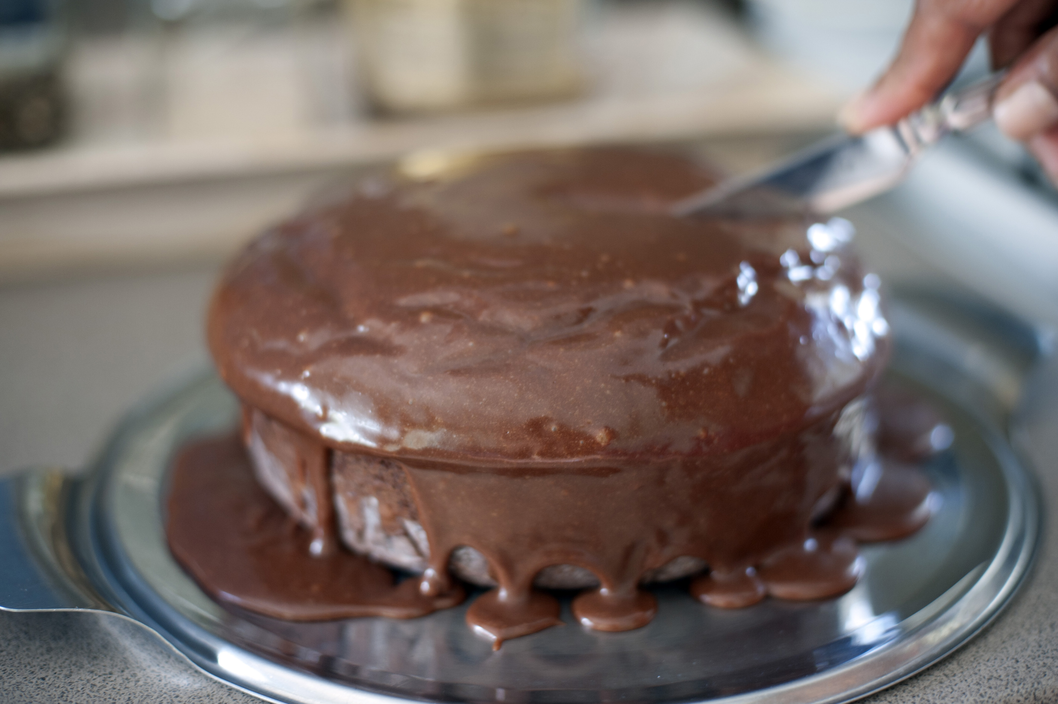 Out of focus knife cutting into chocolate cake with dripping icing over the sides on stainless steel tray