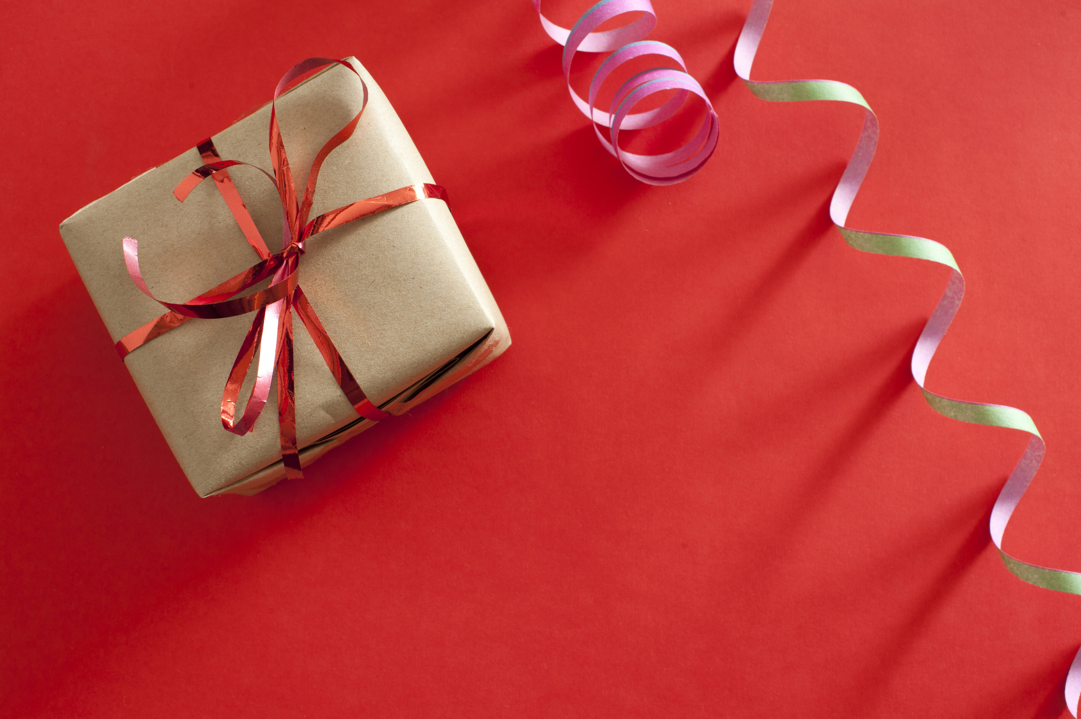 Keywords: above, birthday, celebration, fun, gift, party, present, red, ribbon, top, wrapped, wrapping, brown, copy space, package