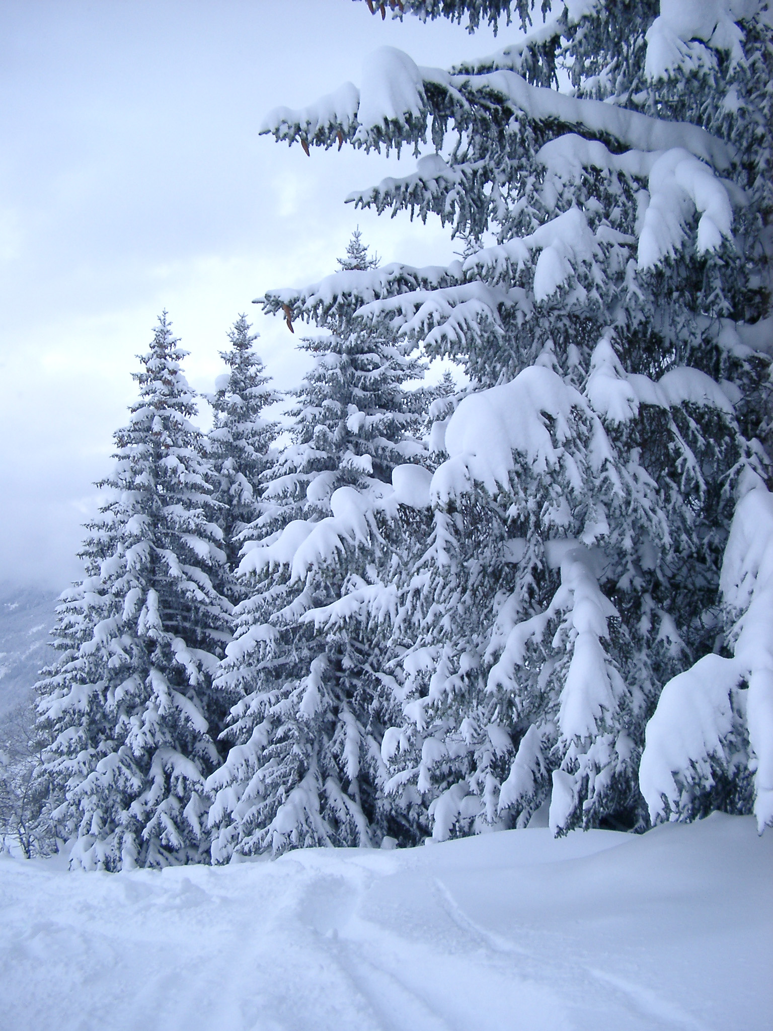 Keywords: winter, snow, holiday, alpine, pinetree, christmas trees, snow covered, festive, christmassy, card, fir, covered, tracks, trails, pine trees, festive