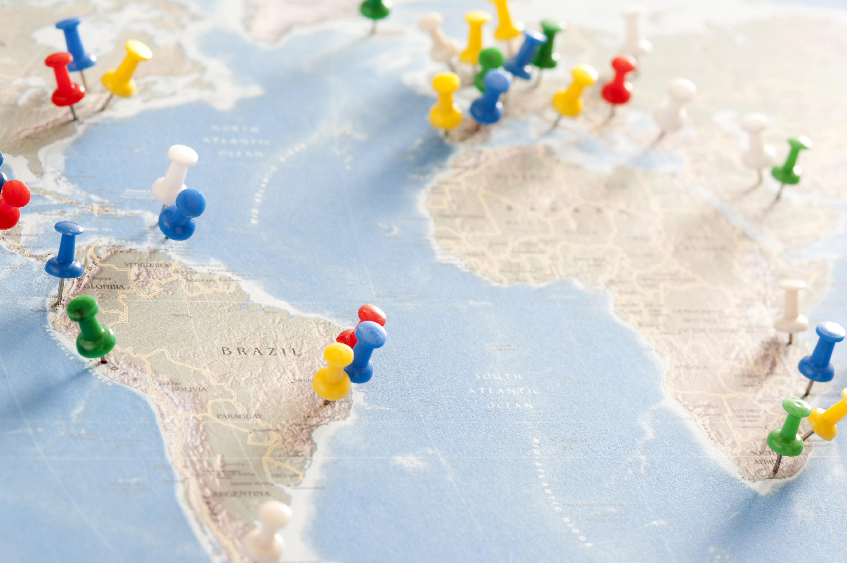 Destination Concept - Close up Colored Pins Pinned on South Atlantic Map