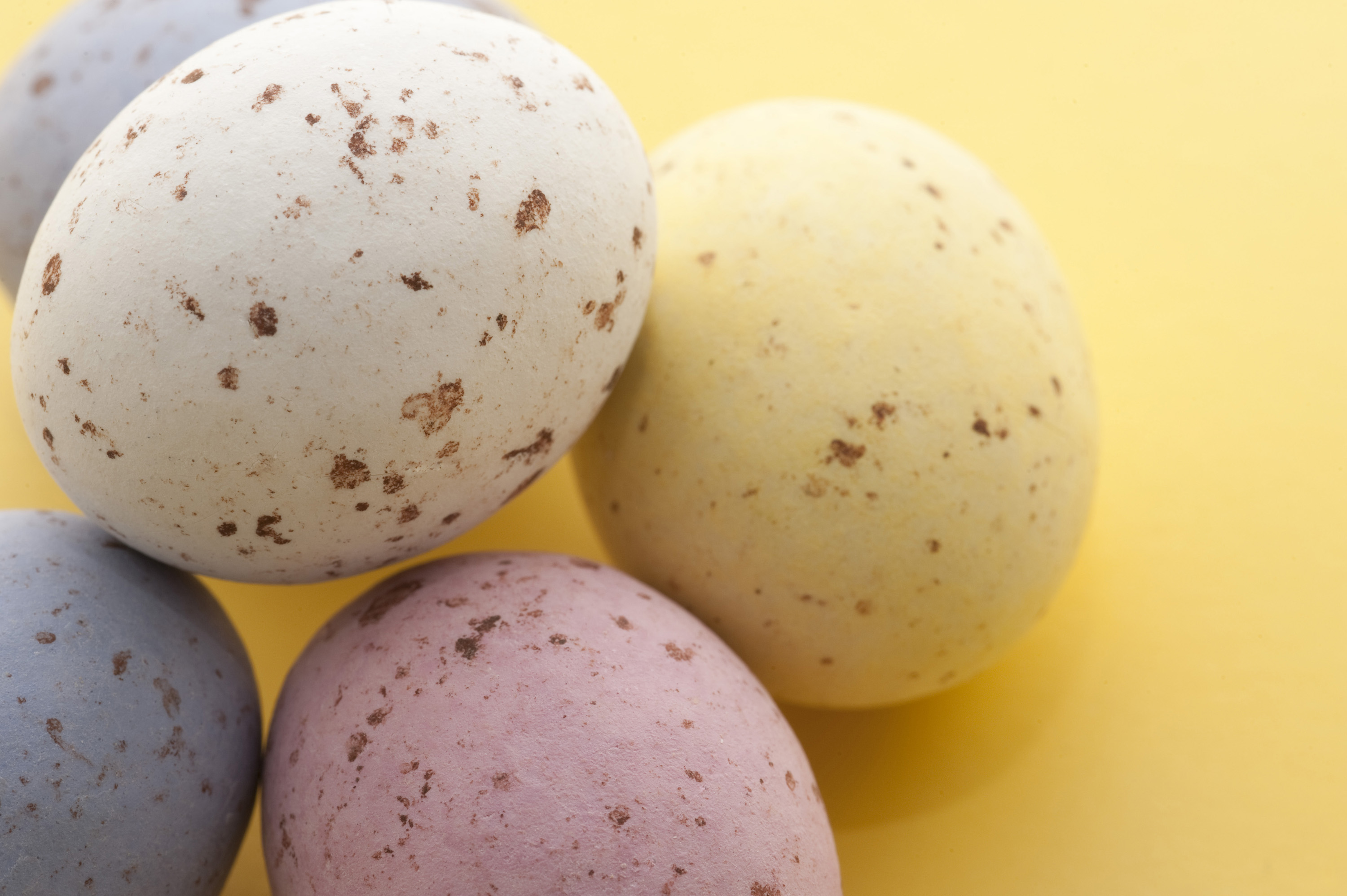 Closeup od pastel coloured speckled Easter Eggs on a yellow background