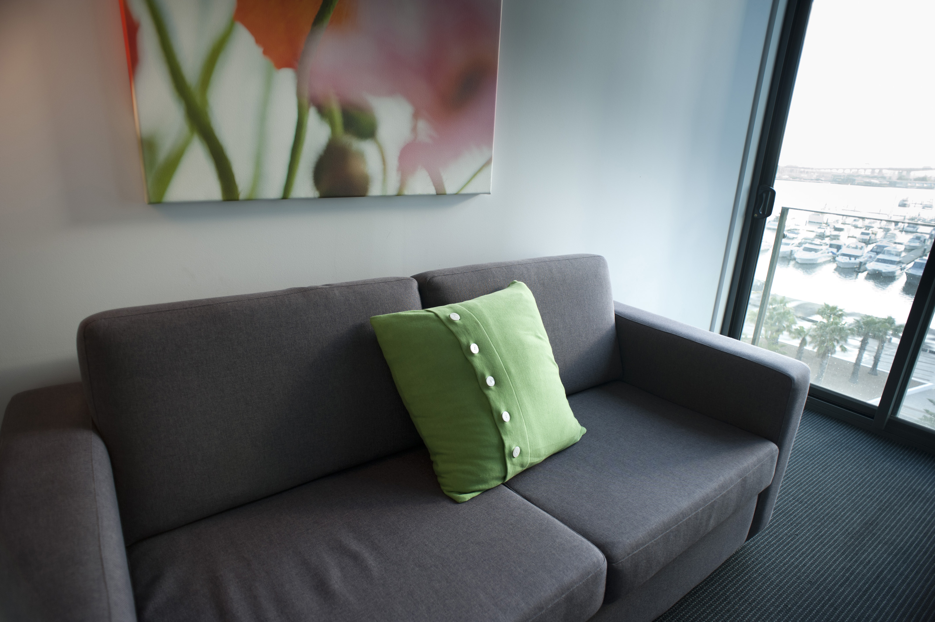 Keywords: couch, living room, lounge, settee, sofa, suite, comfortable, contemporary, grey, indoors, interior, modern, painting, seat, white wall, urban, docklands, city, marina, wharf, boats, view