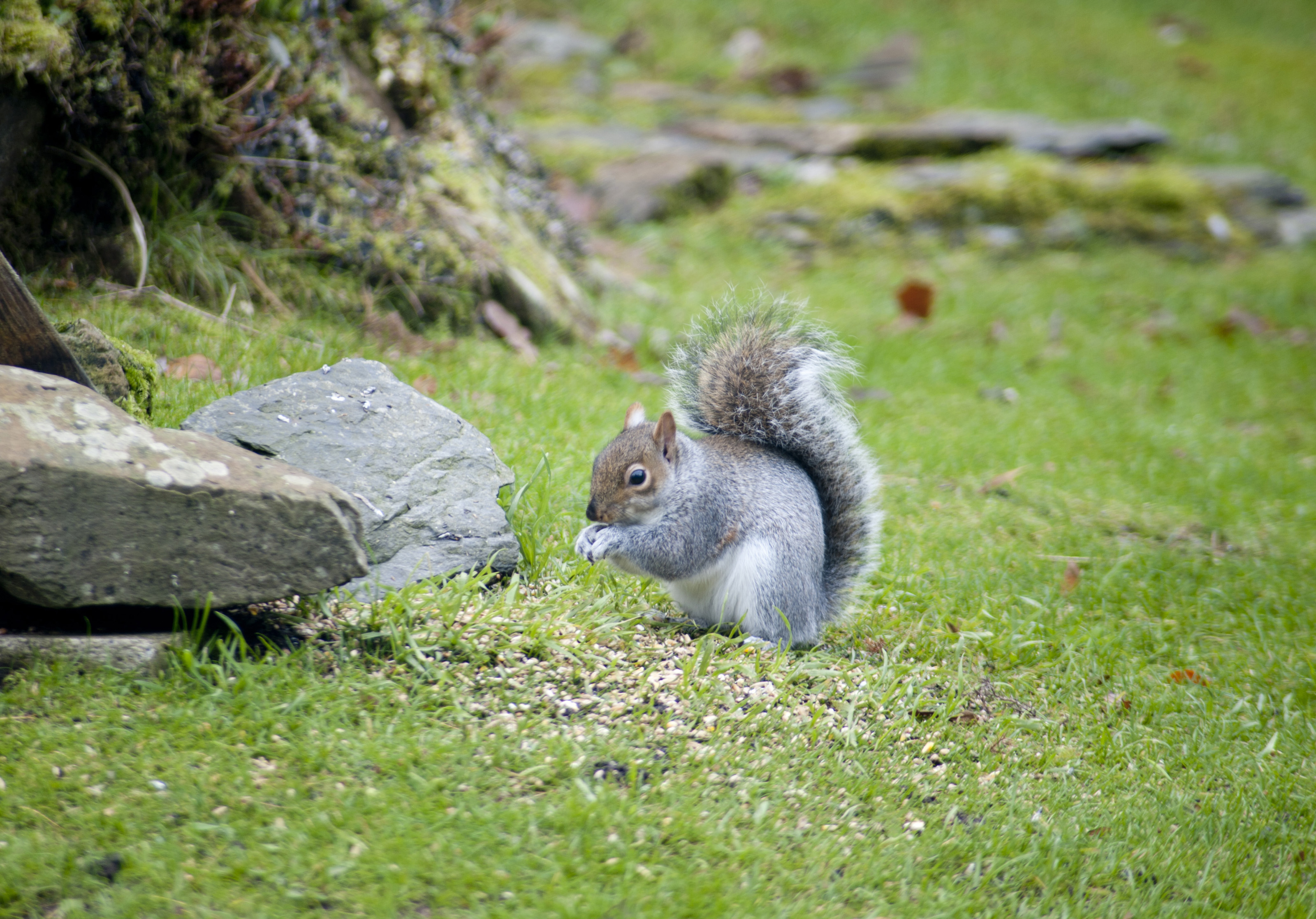 Keywords: garden, animal, arboreal, eating, foraging, grey squirrel, profile, rodent, sciurus, seed, sitting, tail, wild, wildlife, lawn