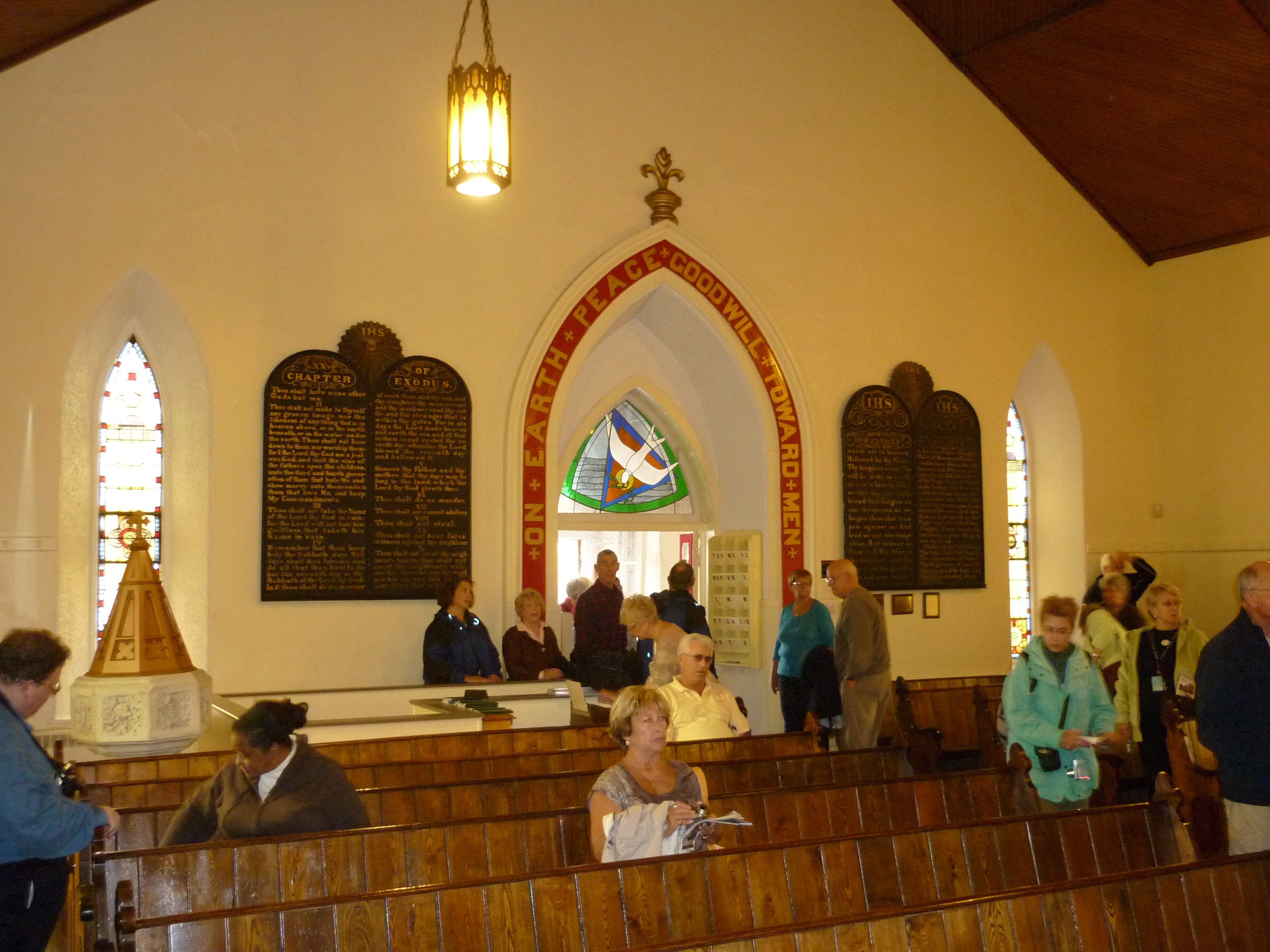 Interior of St George Church looking towards the door with members of the congregation entering and taking seats in pews