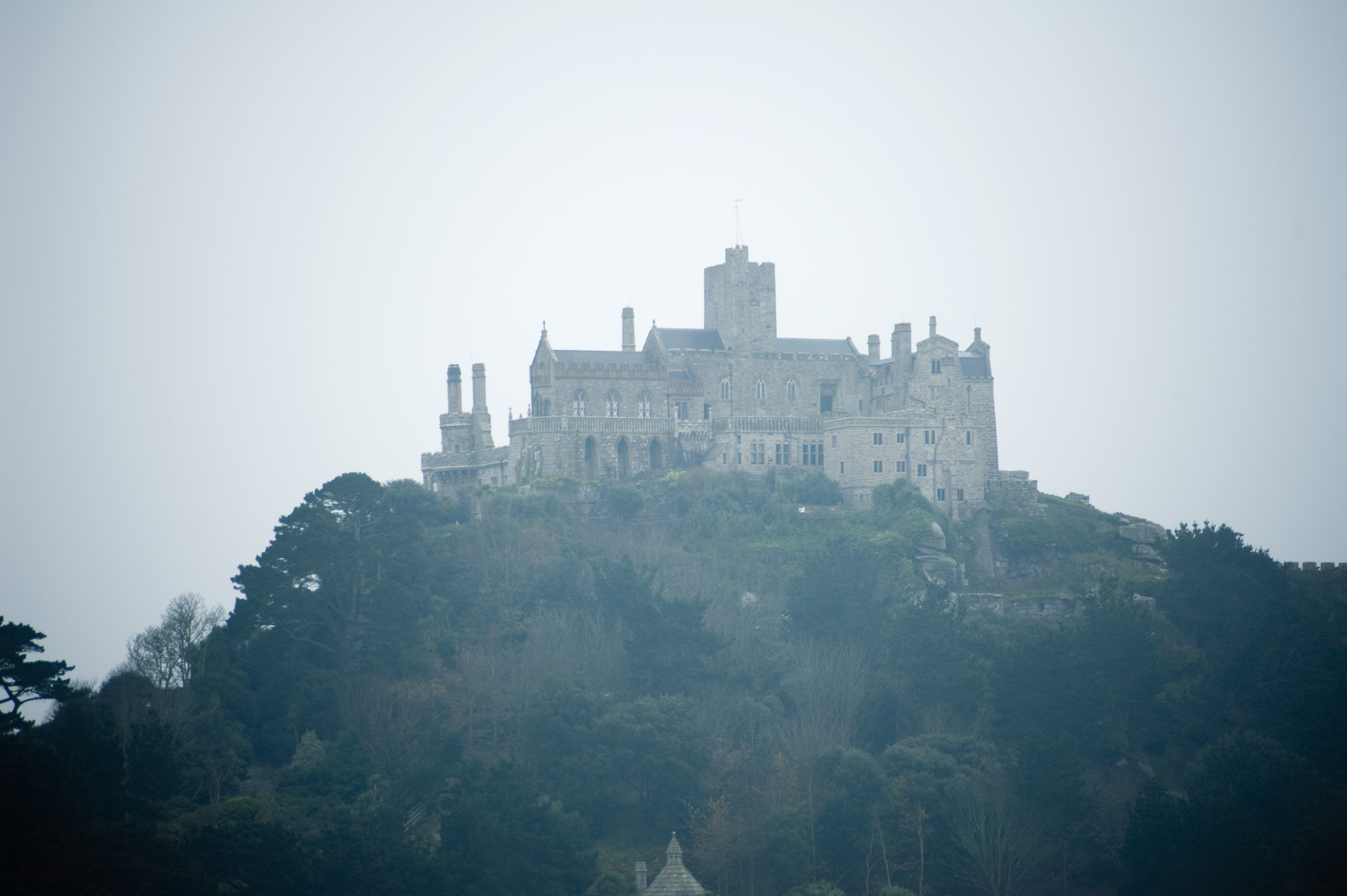 Keywords: cornwall, castle, historic, landmark, stately home, vantage point, the mount, st micheals mount, Karrek Loes y'n Koes, misty, rain, fog