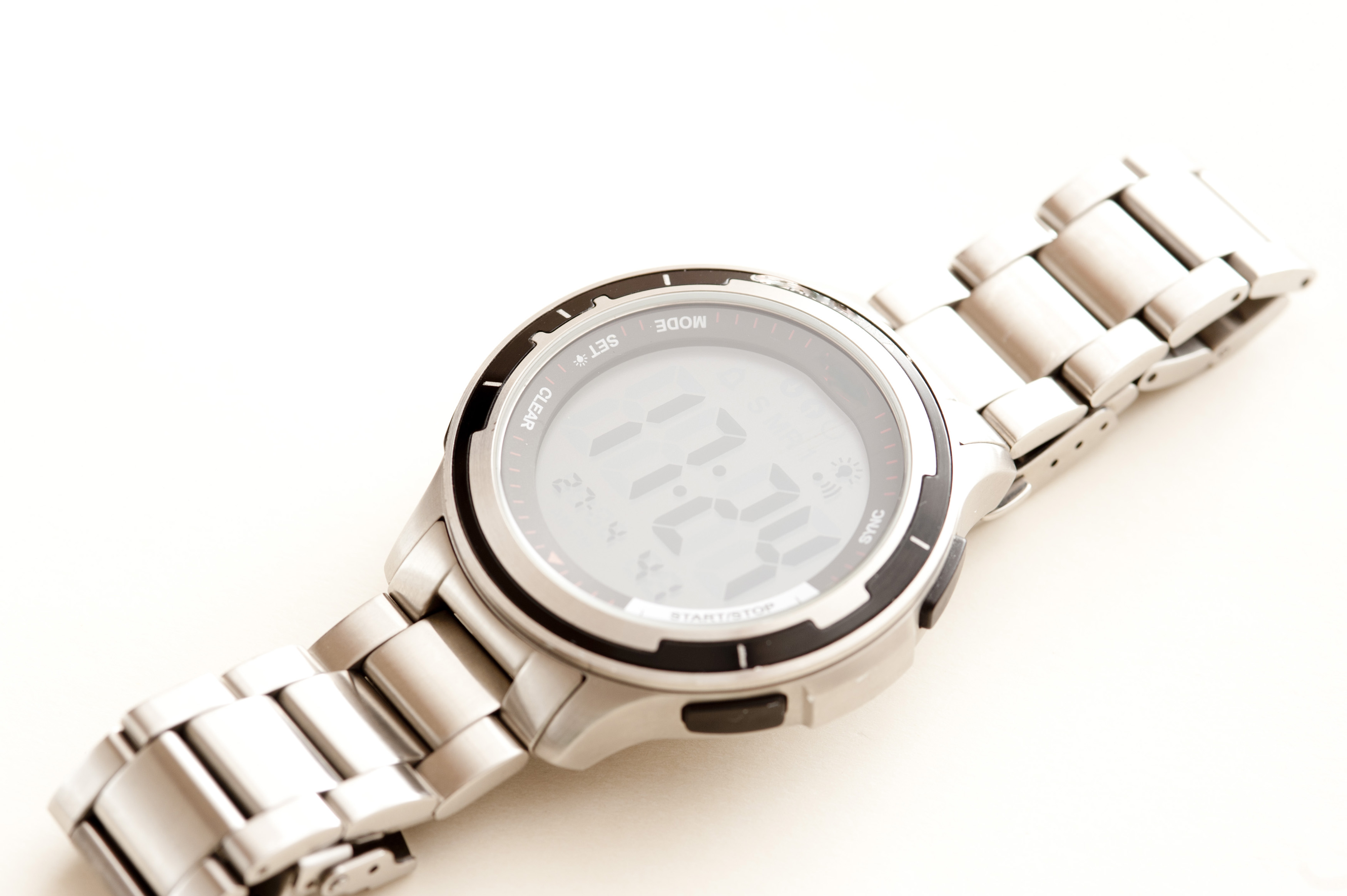 Keywords: background, fashionable, high angle, metal, stainless, steel, stylish, time, watch, white, wrist, face, links, luxury, still life