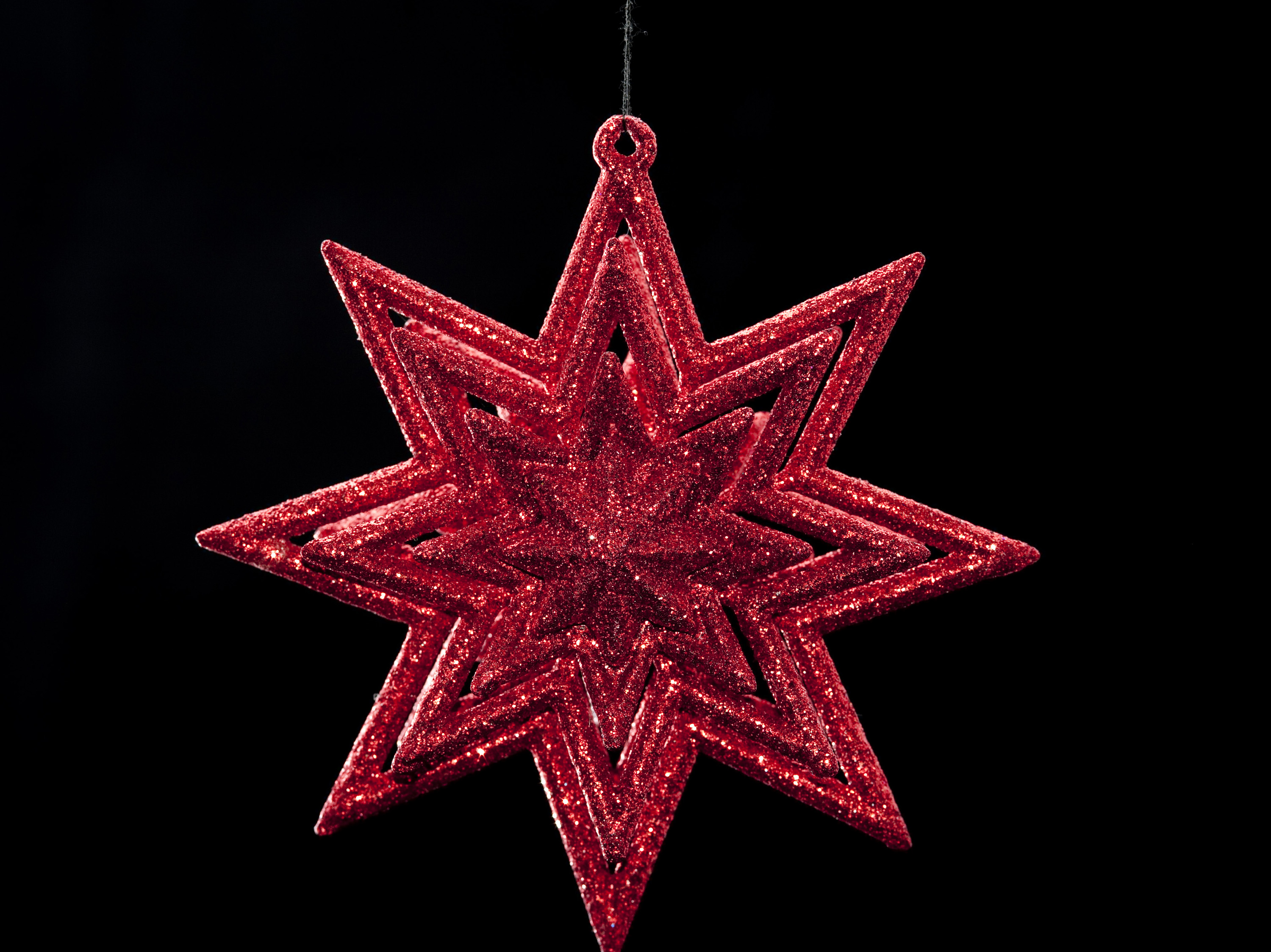 a red sparkly christmas star on black