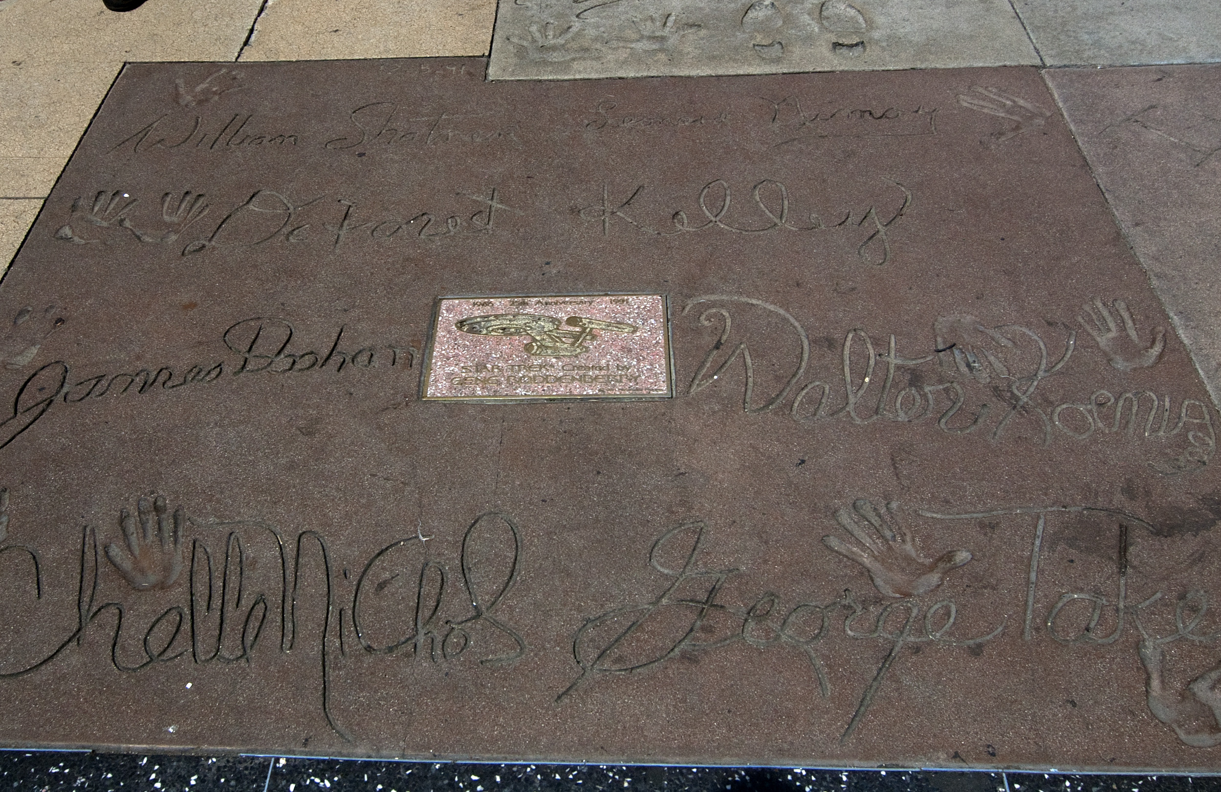 Keywords: sidewalk, pavement, cement, celebrity, famous, star, movie star, Grauman's Forecourt, william shatner, enterprise, starship, foot print, hand print, autograph, signature