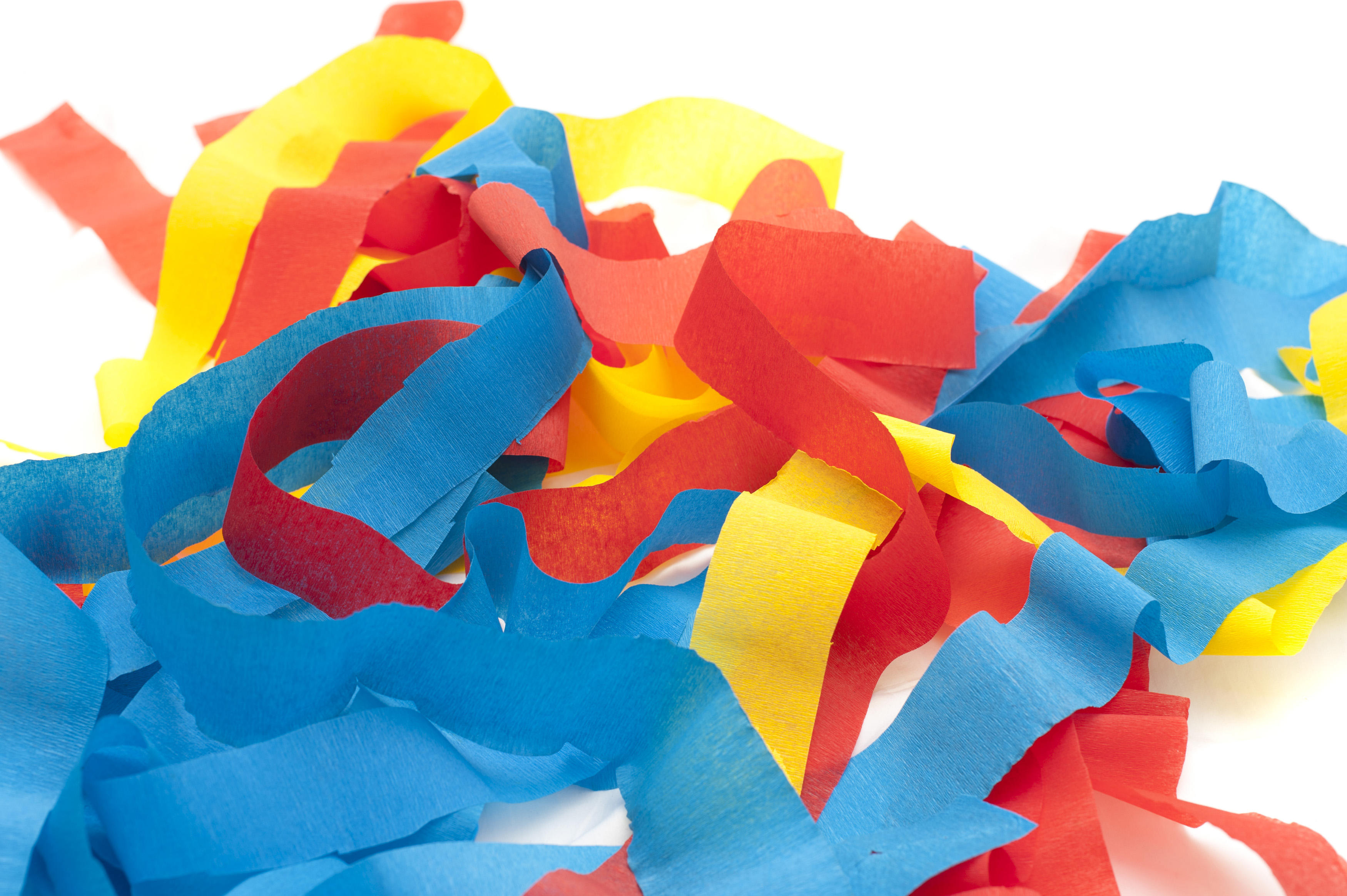 Streamer backdrop with a tangled jumble of colorful red, yellow and blue crepe party streamers for a celebration or festival
