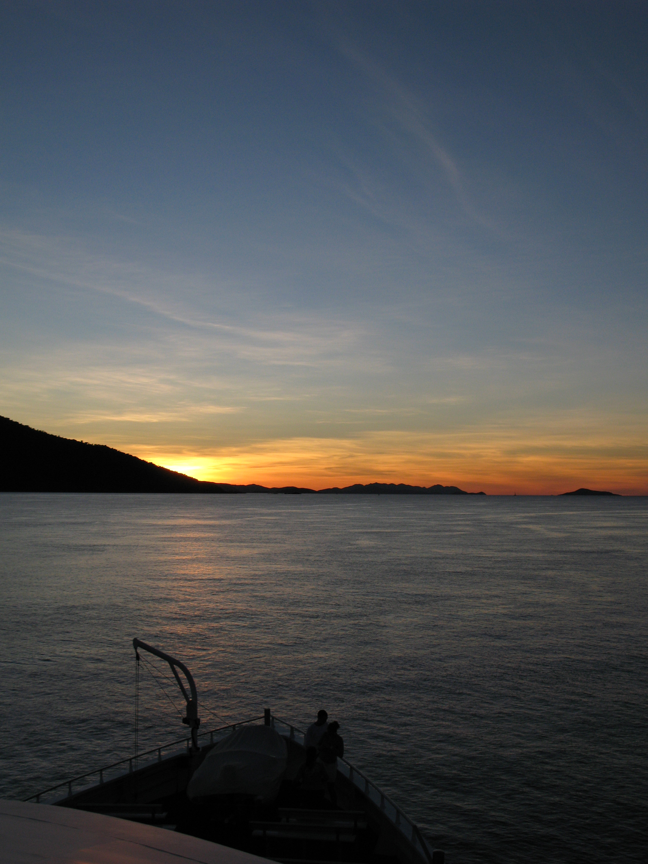 Keywords: return, trip, ocean, voyage, sunset, sailing, twilight, evening, boat, ship, forcastle