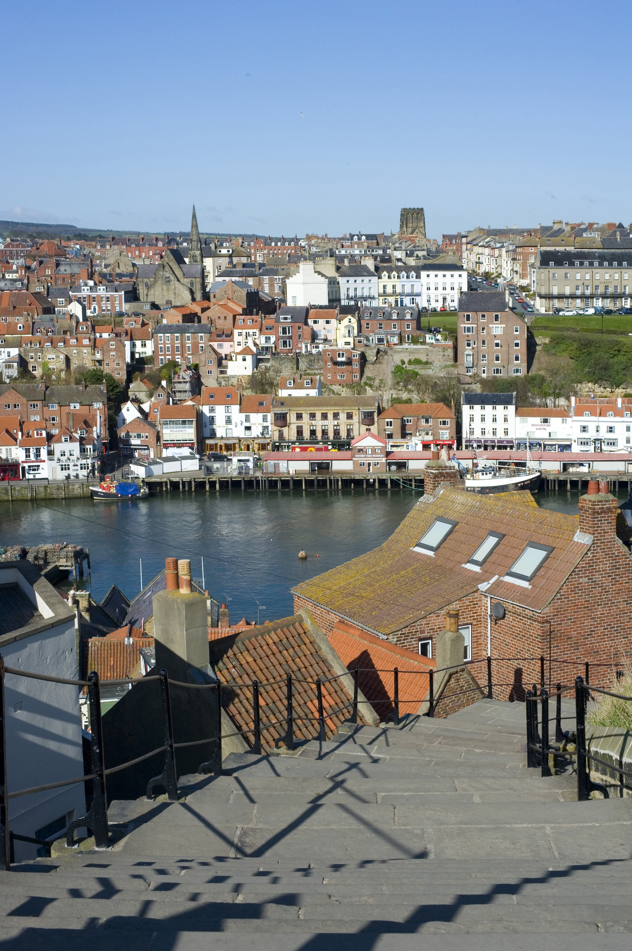 Keywords: travel, scenery, architecture, waterfront, coastal, view, town, historical, picturesque, landmark, england, fishing, steps, english, sightseeing, harbour, hillside, high angle, topography, whitby, north yorkshire, st marys church, tate hill, 199, east cliff