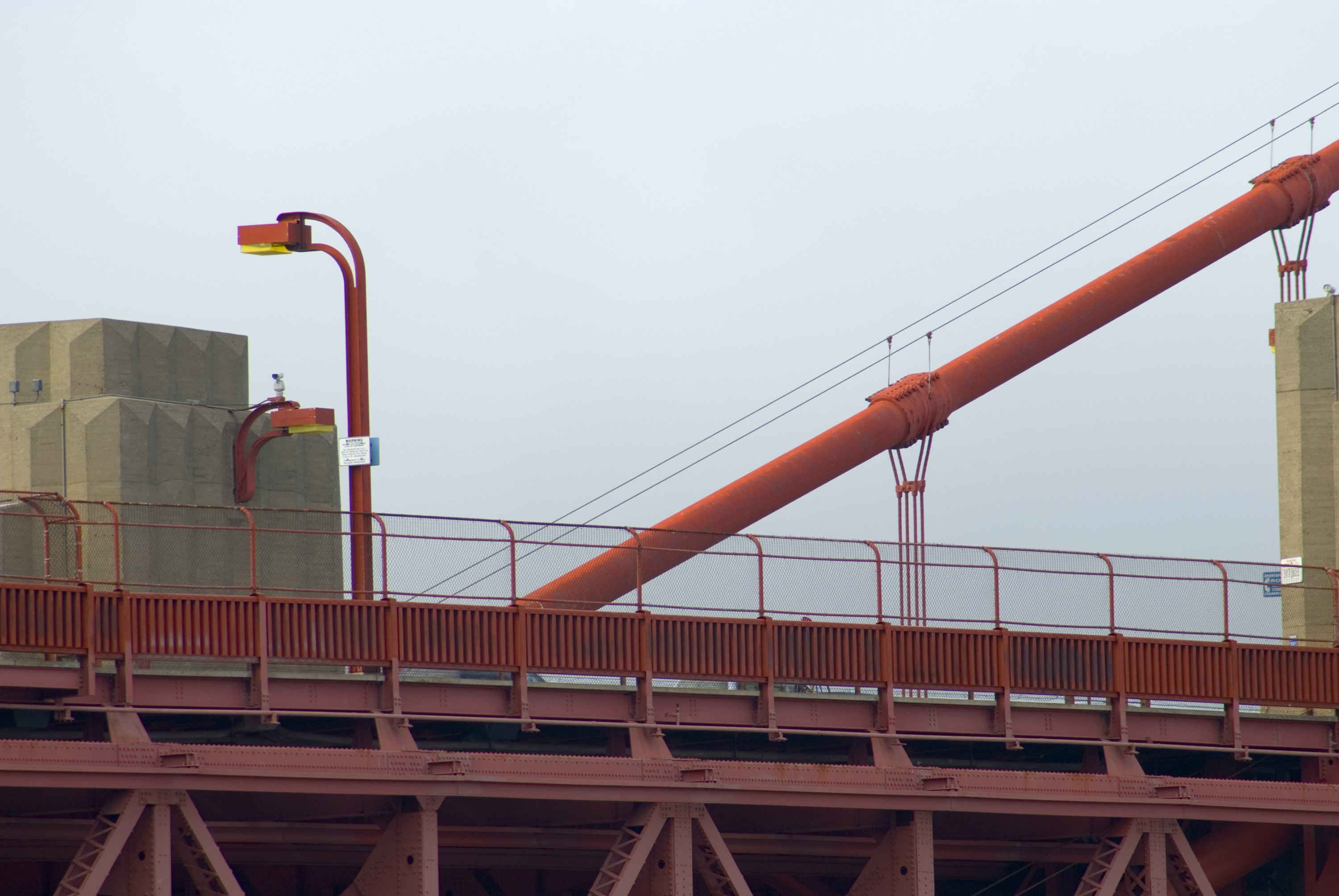 Keywords: suspension cables, golden gate, bridge, landmark, red, painted, icon, san francsico, close up, detail, view, engineering, girders, structure, supports, street light, lamp post, barrier, metal