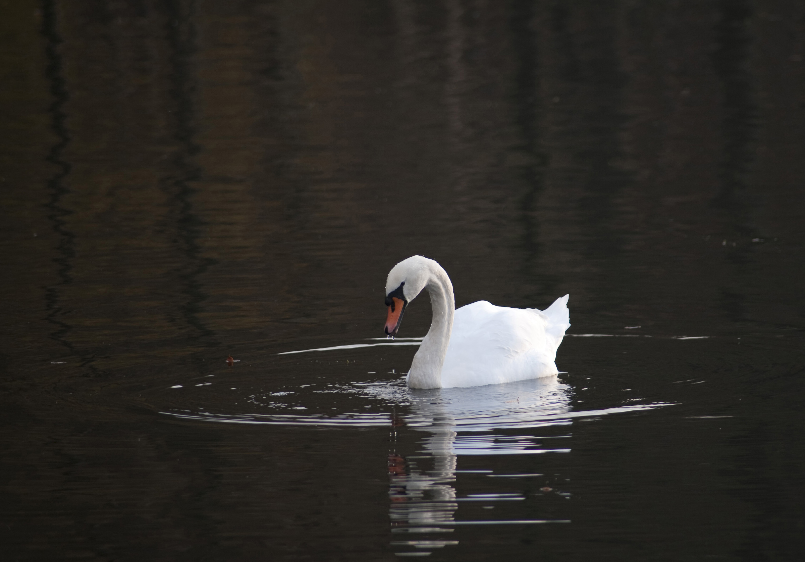 Beautiful white swan swimming on dark lake water with a reflection