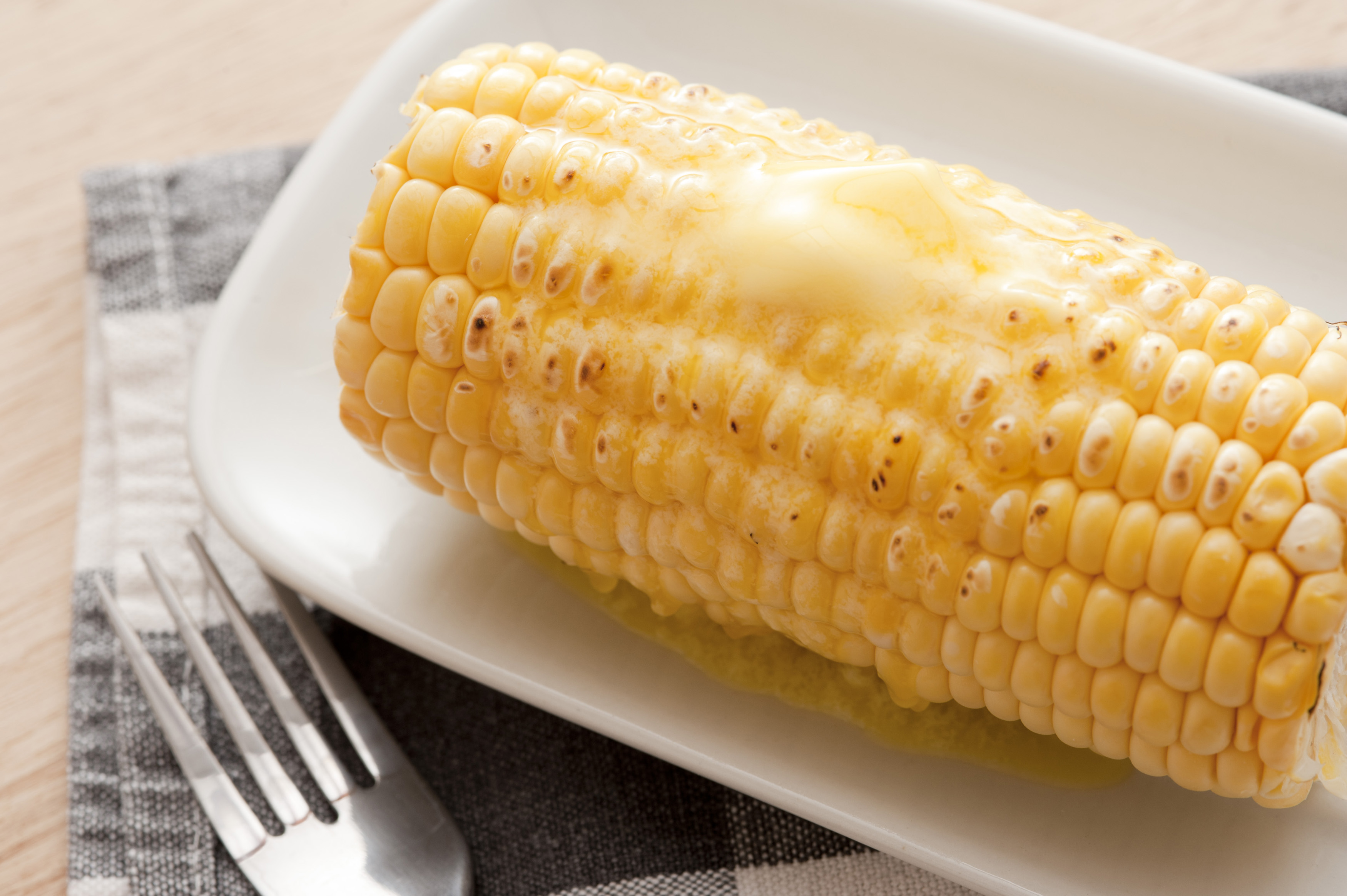 Keywords: corn, corncob, maize, sweet corn, fresh, food, vegetable, cooked, butter, melting, carbohydrate, kernels, plate, serving, nutrition