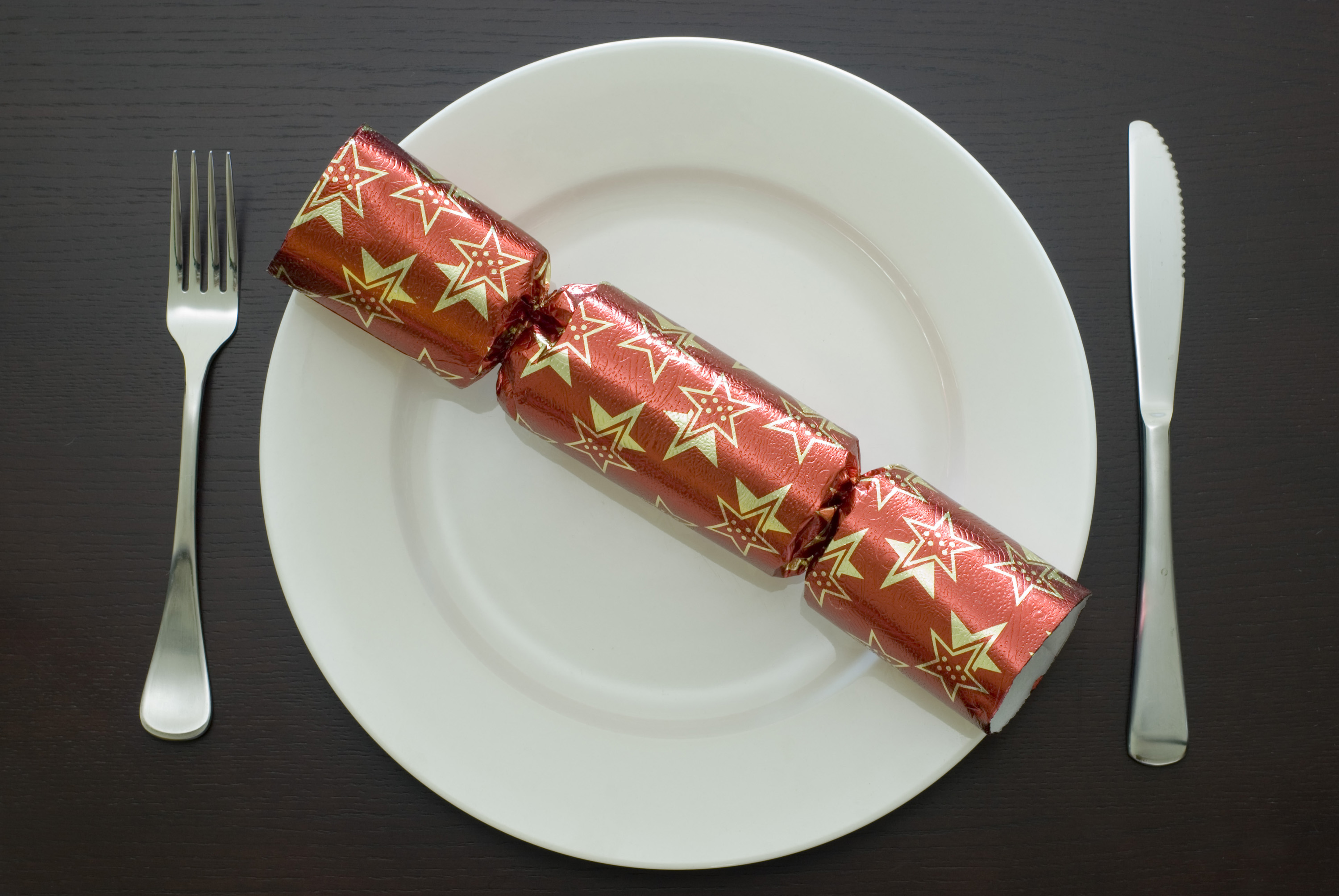 a table setting with a knife, fork, plate and a christmas cracker