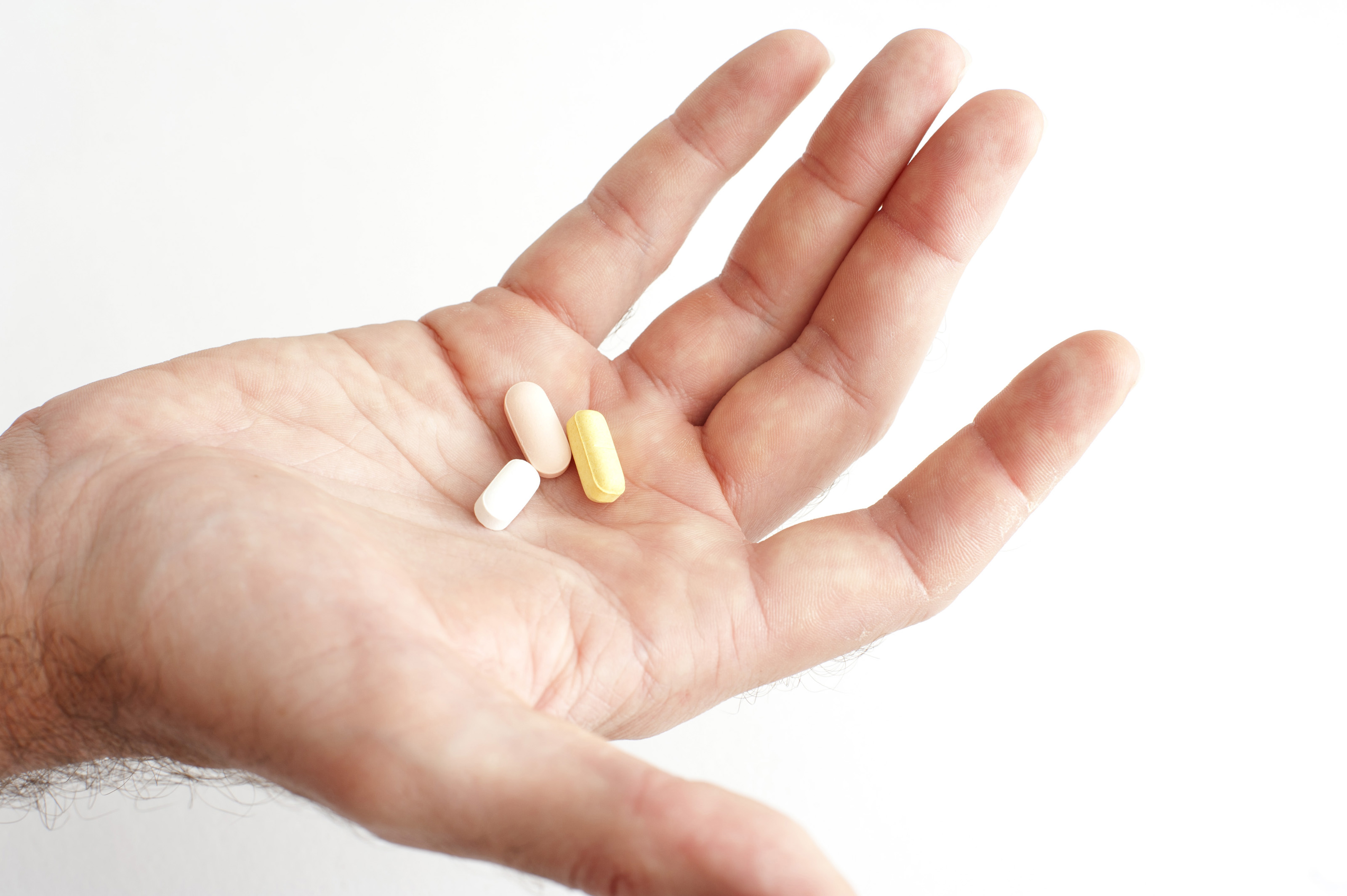 Man taking his daily medication holding out his palm containing three capsules and tablets in a healthcare and medical concept