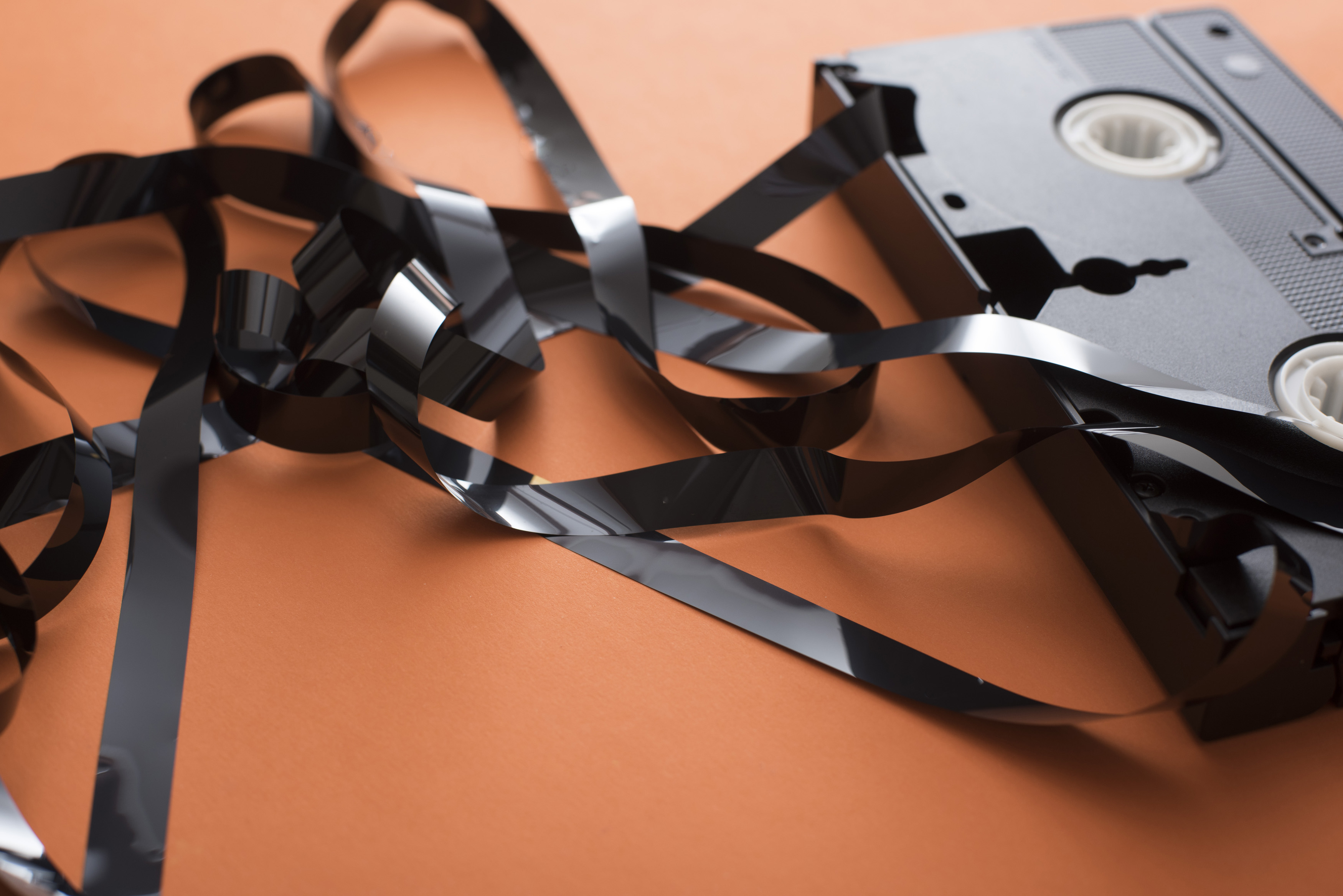 VHS cassette with tangled tape in close-up on orange table surface