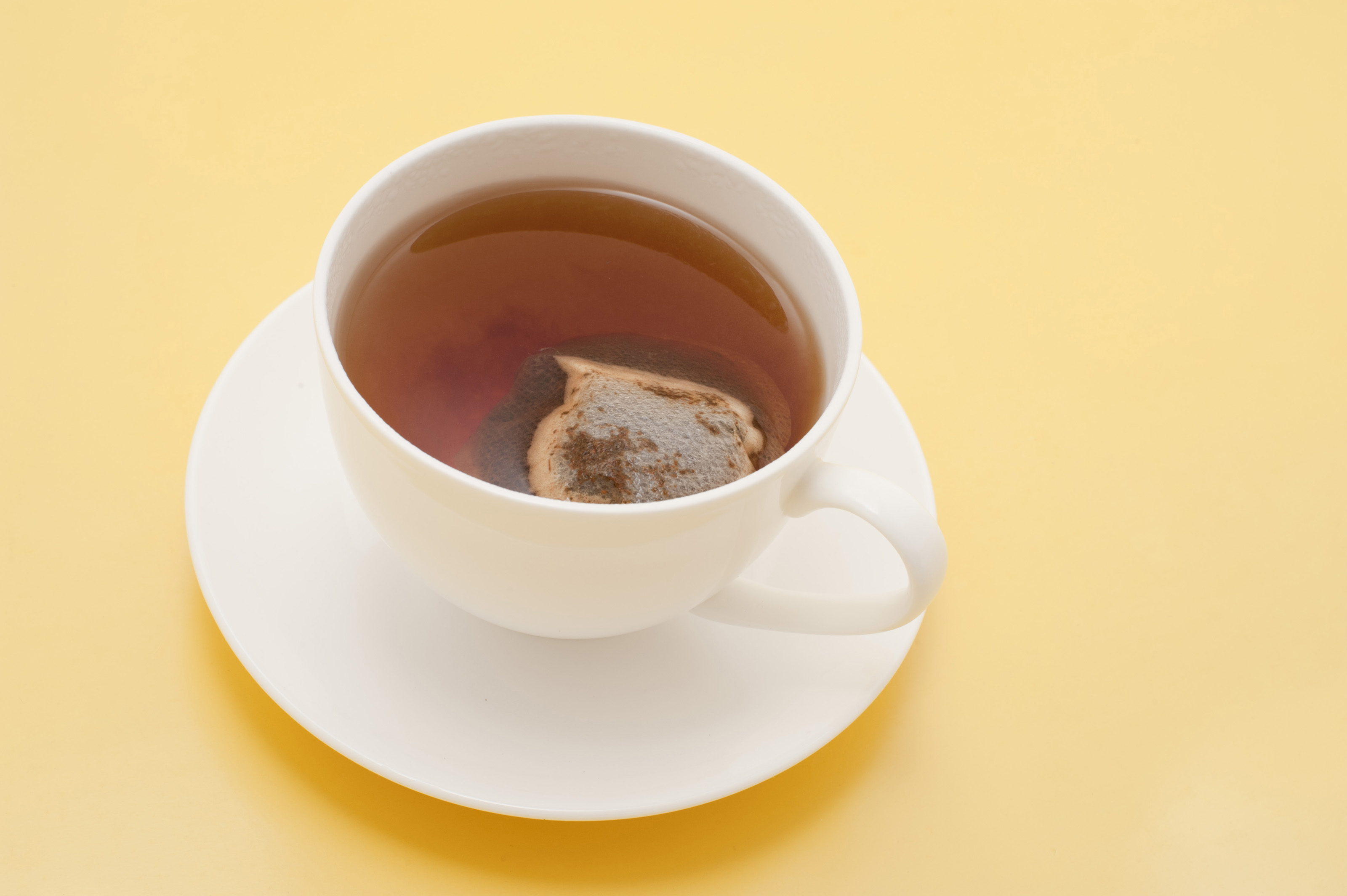 Cup of freshly brewed refreshing hot black tea served in a plain white cup and saucer for a relaxing morning tea break viewed high angle on a yellow background with copyspace
