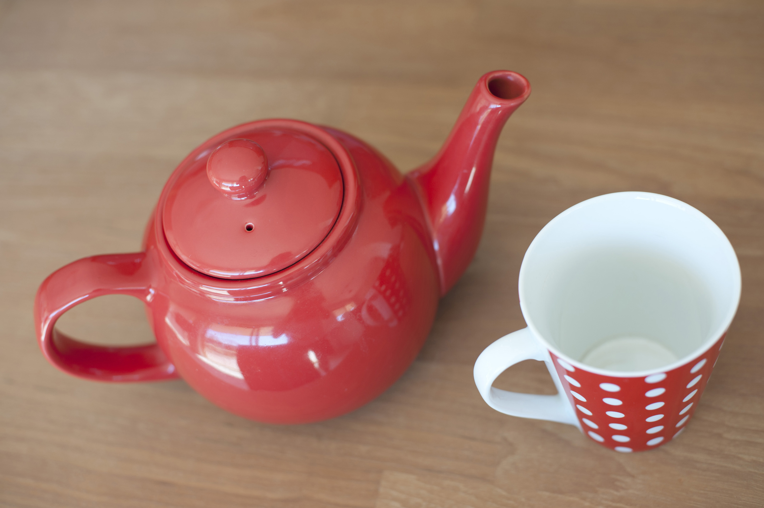 Keywords: ceramic, mug, polka dot, pottery, pour, red, service, tea, teapot, teatime, beverage, brew, tea break, bulbous, drink