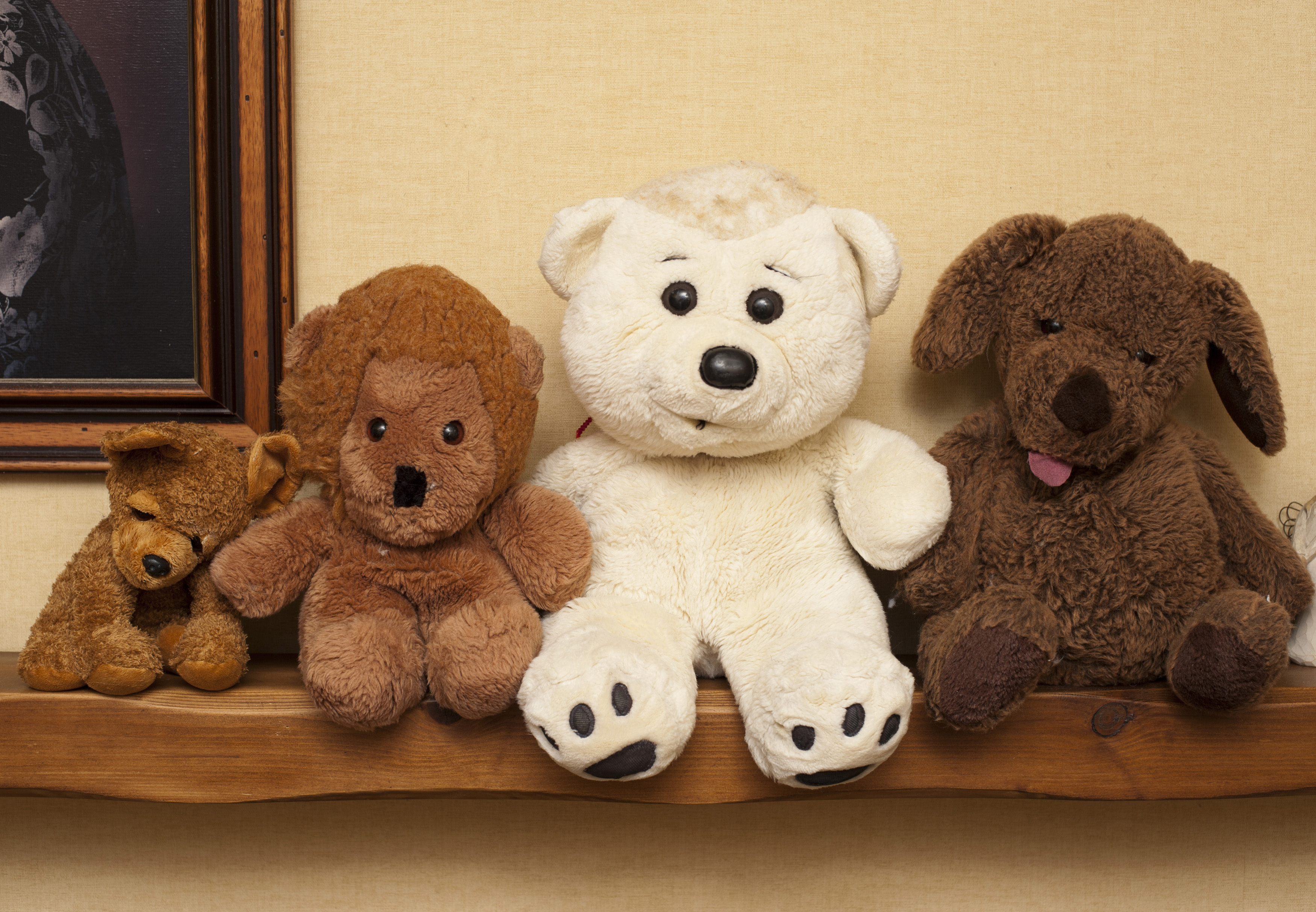Photo Title: Row of assorted soft plush toys on a shelf