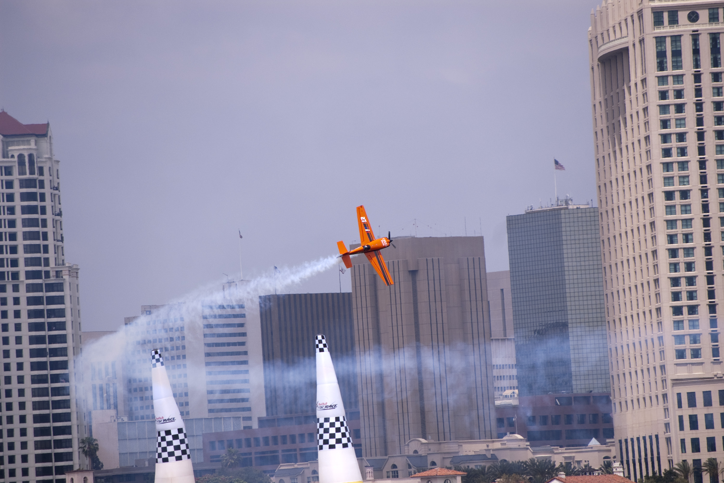 editorial use only : a plane flys through the finish gate at the san diego red bull air race