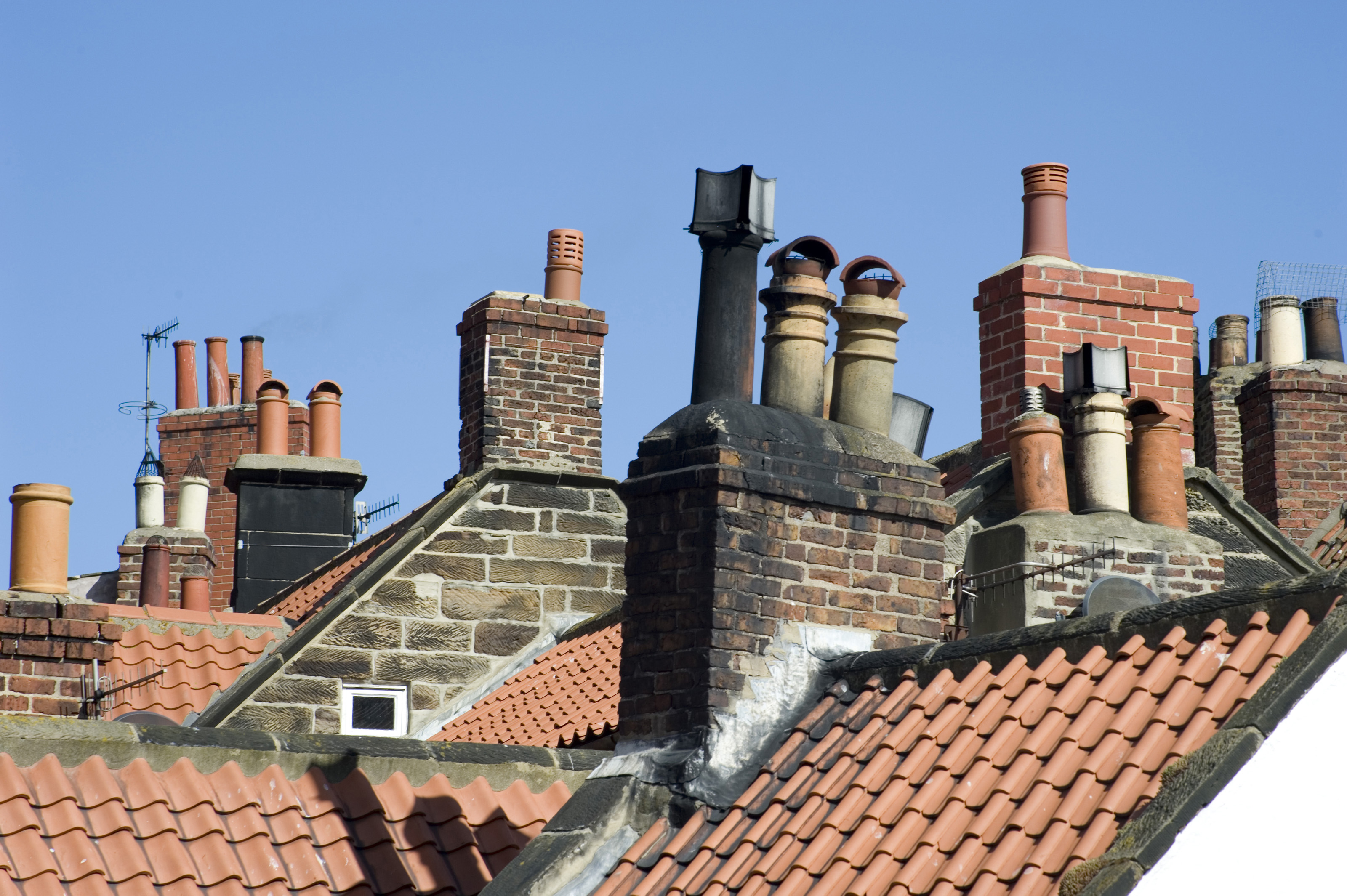 A view across tiled rooftops showing the roof details with chimney stacks and pots
