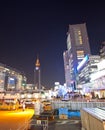 tall office buildings in tokyo brightly lit at night