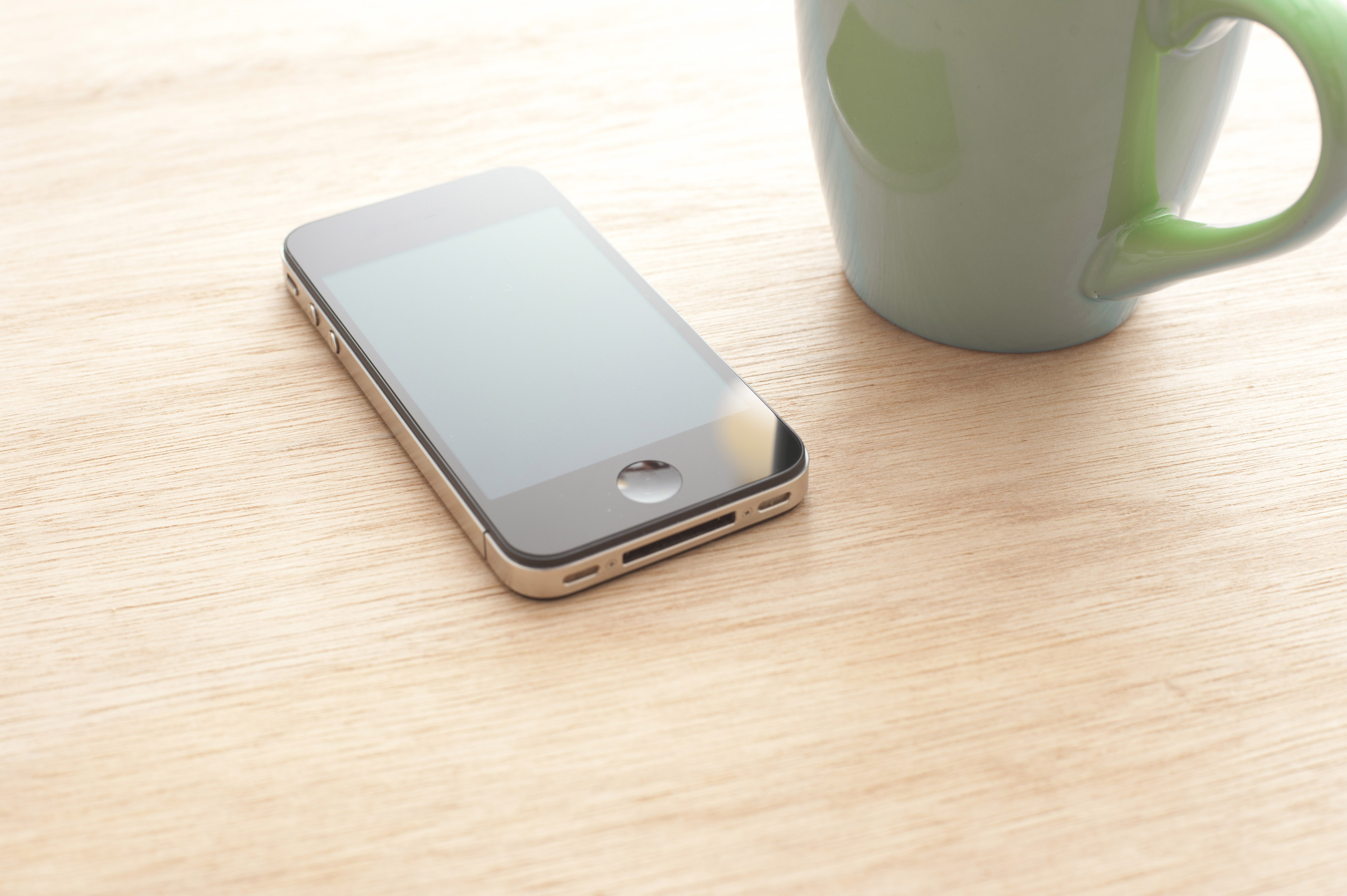 Keywords: electronics, close-up, black, mug, phone, smartphone, table, touch screen, device, mobile, green, old, copy space, communication, simple, minimal, minimalist
