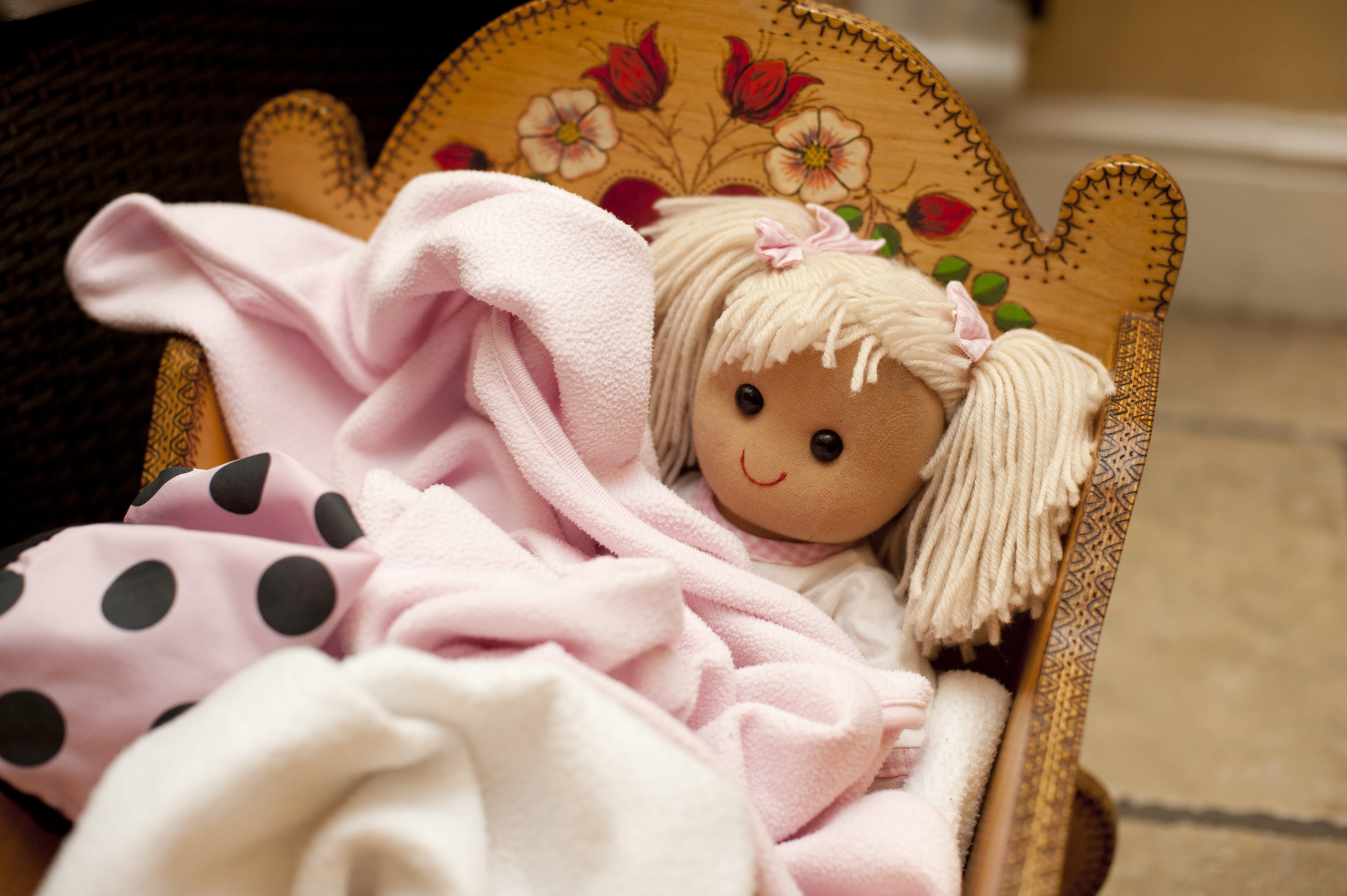 Cute little blond doll in a crib wrapped in a soft pink blanket in a kids playroom , close up high angle view